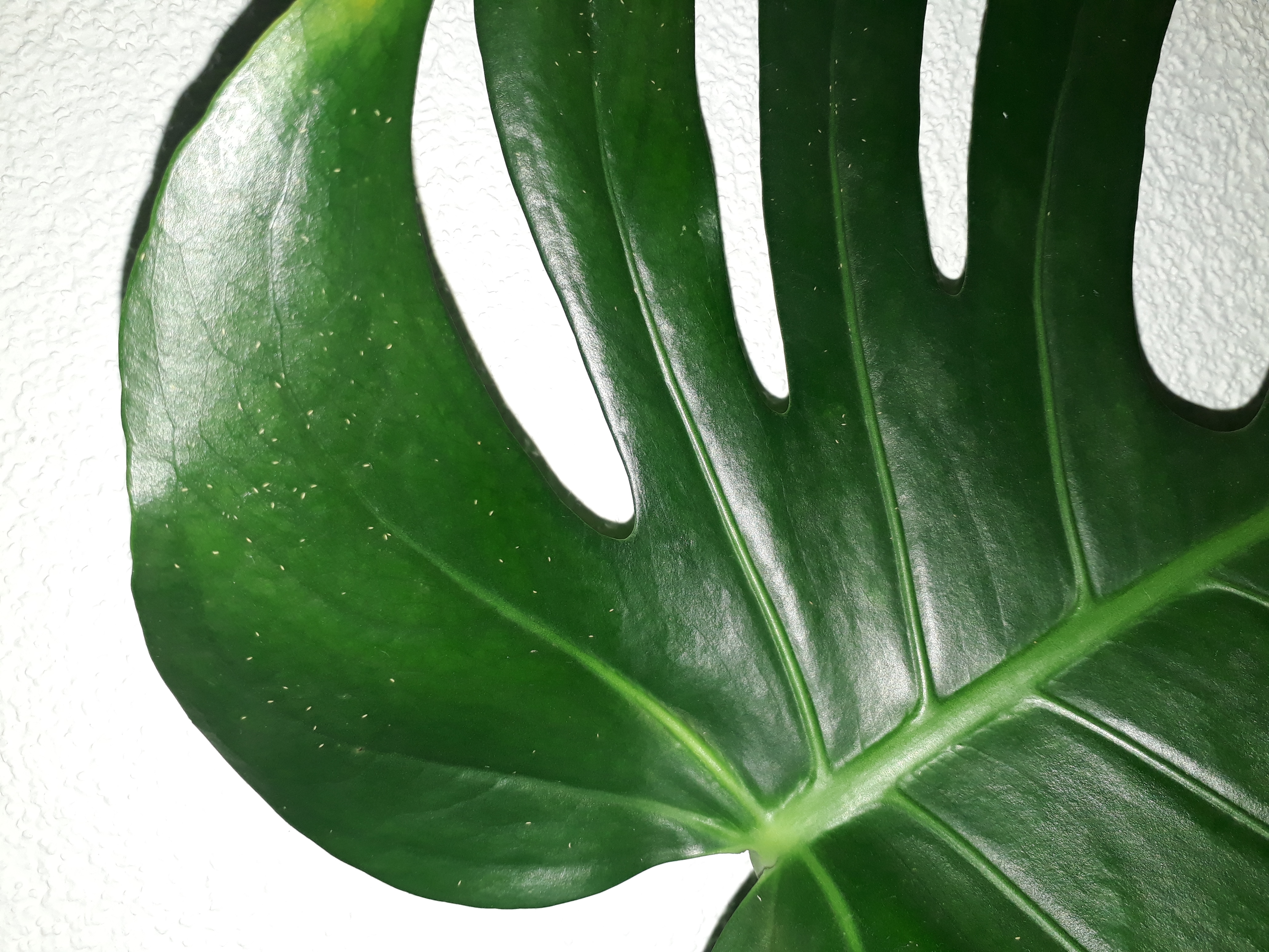 Nun zu den Kleinen Tierchen (oder was auch immer) die mich verunsichern/mir angst machen. SIe sind ca. 1 mm gross, weiss und auf der Blattoberseite. Ich wasche sie manchmal mit einem nassen lumpen weg, sie kommen aber nach ein paar tagen wieder sehr zahlreich auf Blätter und Stengel.