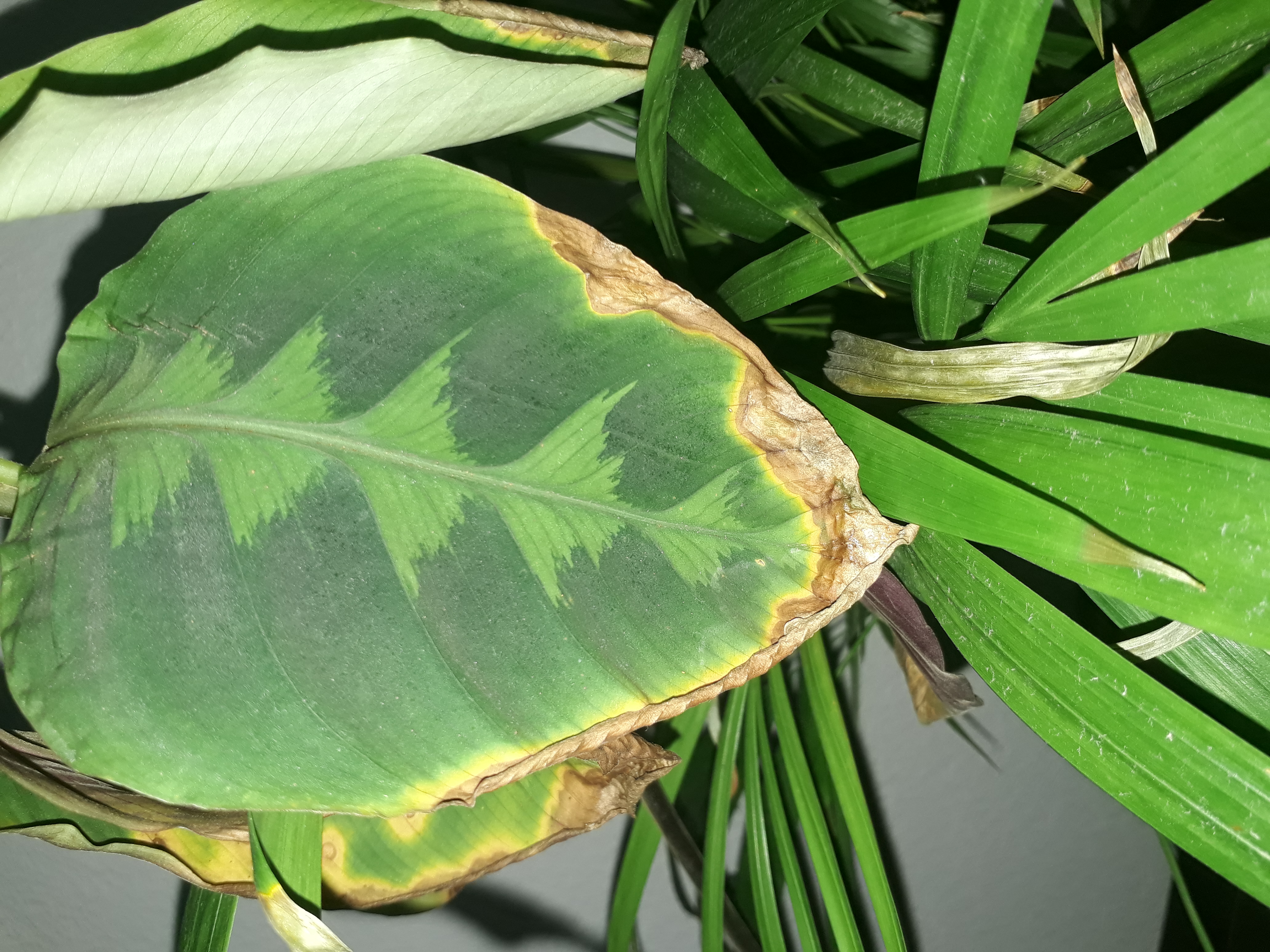 Ich bin vor kurzem mit all meinen Pflanzen in eine neue WG gezügelt. Meine Pflanzen waren bis dato alle gesund abgesehen von einem Leichten Trauermückenbefall, welcher ich eigentlich gut im Griff zu haben dachte. Meine neue Mitbewohnerin hatte einige Pflanzen und einer davon ging es gar nicht gut. Eine Calathea mit akutem Spinnmilbenbefall (erkannte man sehr gut, an den Netzen an der Blattunterseite und eigentlich auch überhaupt überall auf der Pflanze. Viele Blätter waren bereits verkümmert.). Ich wollte ihr helfen, diesen in den Griff zu bekommen. Wir haben die Blätter abgeschnitten, die Pflanze gewässert, regelmässig besprüht und wie im Internet überall beschrieben in einen Plastiksack eingepackt. Das ist nicht das eigentliche Problem. Ich hatte ihre Calathea aufgegeben, als fast ALLE(!) meine Pflanzen anfingen verkümmerte Blätter zu haben. Die Blätter trocknen vom Rand her aus und verkümmern, werden gelb und vertrocknen. Folgende Pflanzen sind Betroffen: meine Calathea, Papyrus, Monstera, Areca Palme, Phylodendron und mein Zebra-Ampelkraut und 2 Sukkulenten (weiss die Namen leider nicht). Momentan sind nur die Calathea, die Areca Palme, Monstera und die beiden Sukkulenten überlebend. Meines wissens nicht davon betroffen sind (momentan...) Elefantenfuss, Aloe Vera und Bogenhanf.