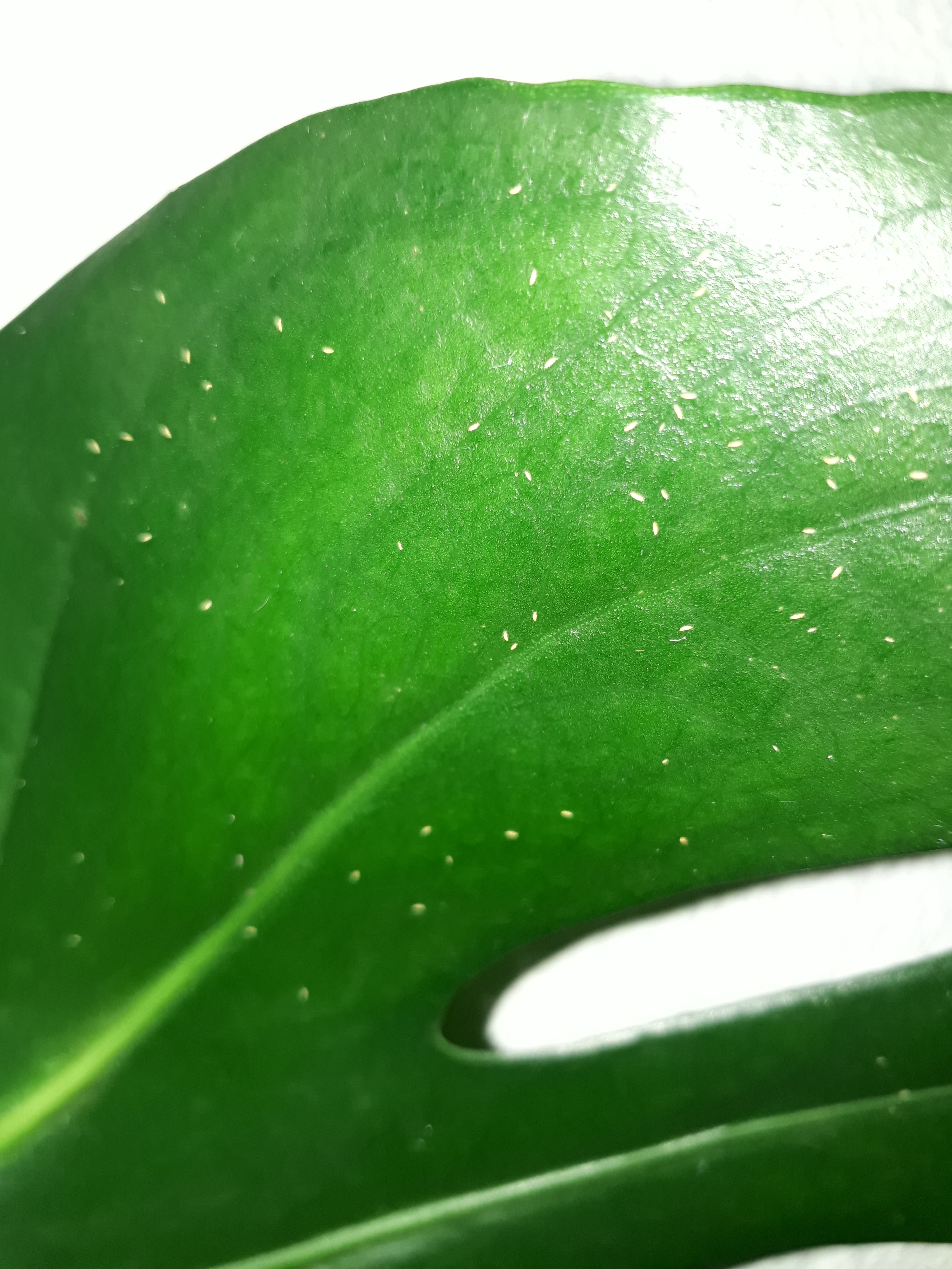 Ich dachte erst, dass es Spinnmilben sind, kann aber nirgends Spinnweben erkennen. Auch sind sie auf der Blattoberseite und nicht auf der Blattunterseite wie üblich für Spinnmilben. Ausserdem überleben sie mehrmaliges besprühen vom insektizid gegen Spinnmilben... Ein Kollege meinte Thrypse, aber die sind schwarz und sehen meiner Meinung ganz anders aus. Sie sind zwar weiss, aber kleine Fliegen sind es auch nicht...