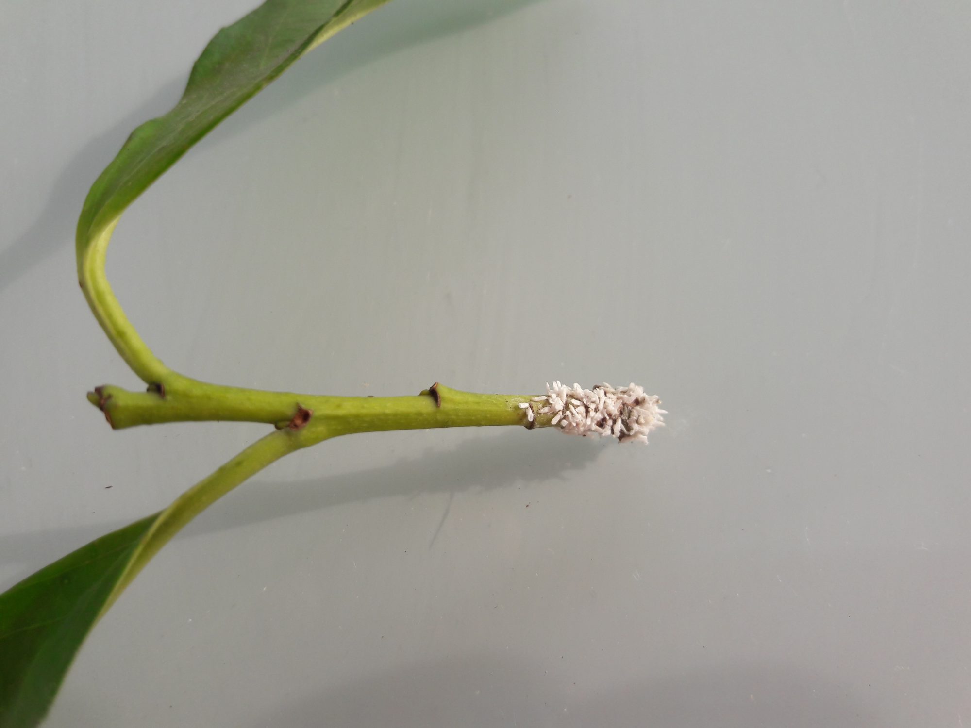 am linken nichts und am rechten hat meine Frau zufällig , an ca. 10 zweigen diese weißen gebilde gefunden, sicher keien Fliege, bewegen sich nicht, ja schauen ähnlich der Maulbeerschildlaus aus