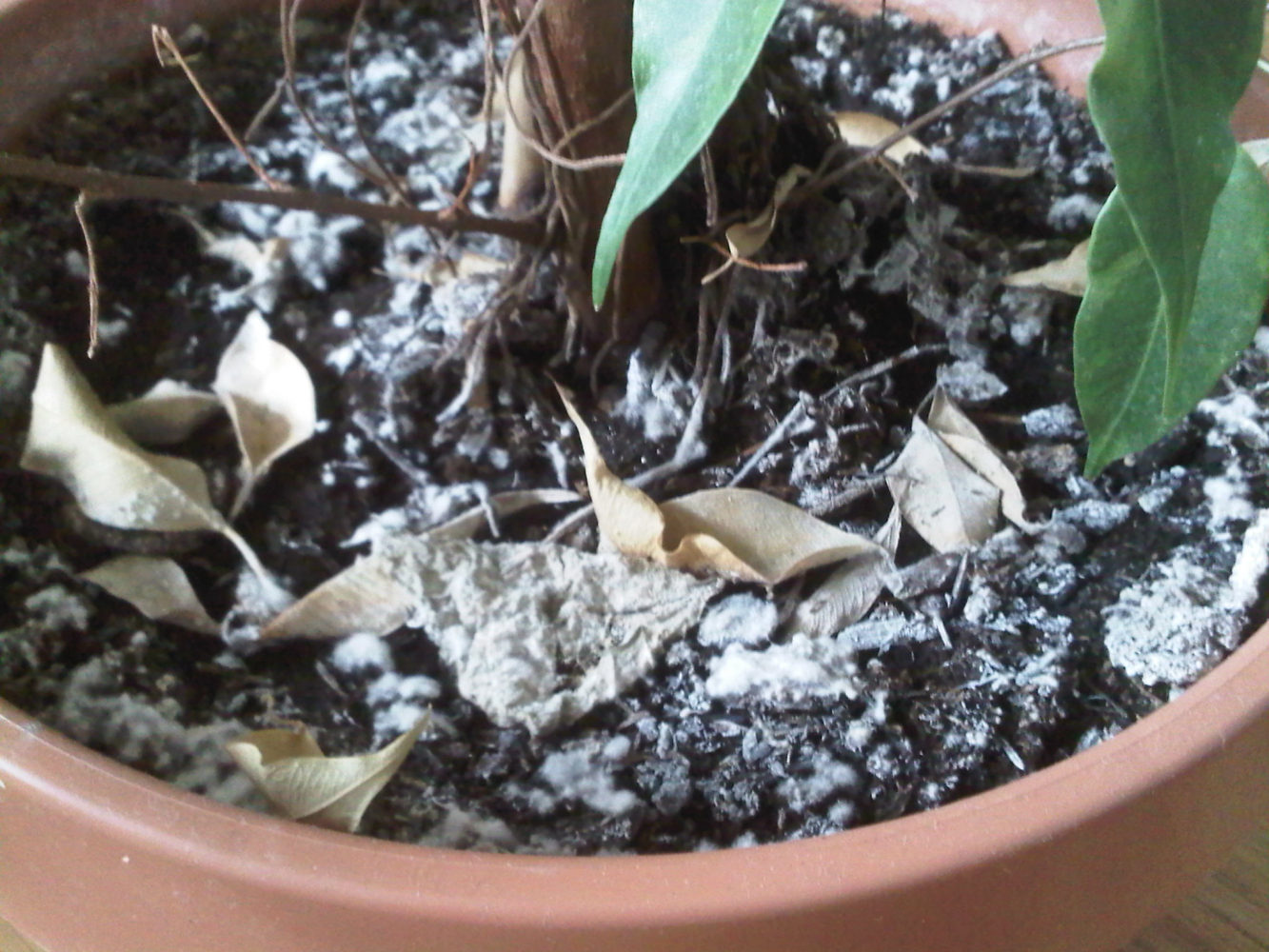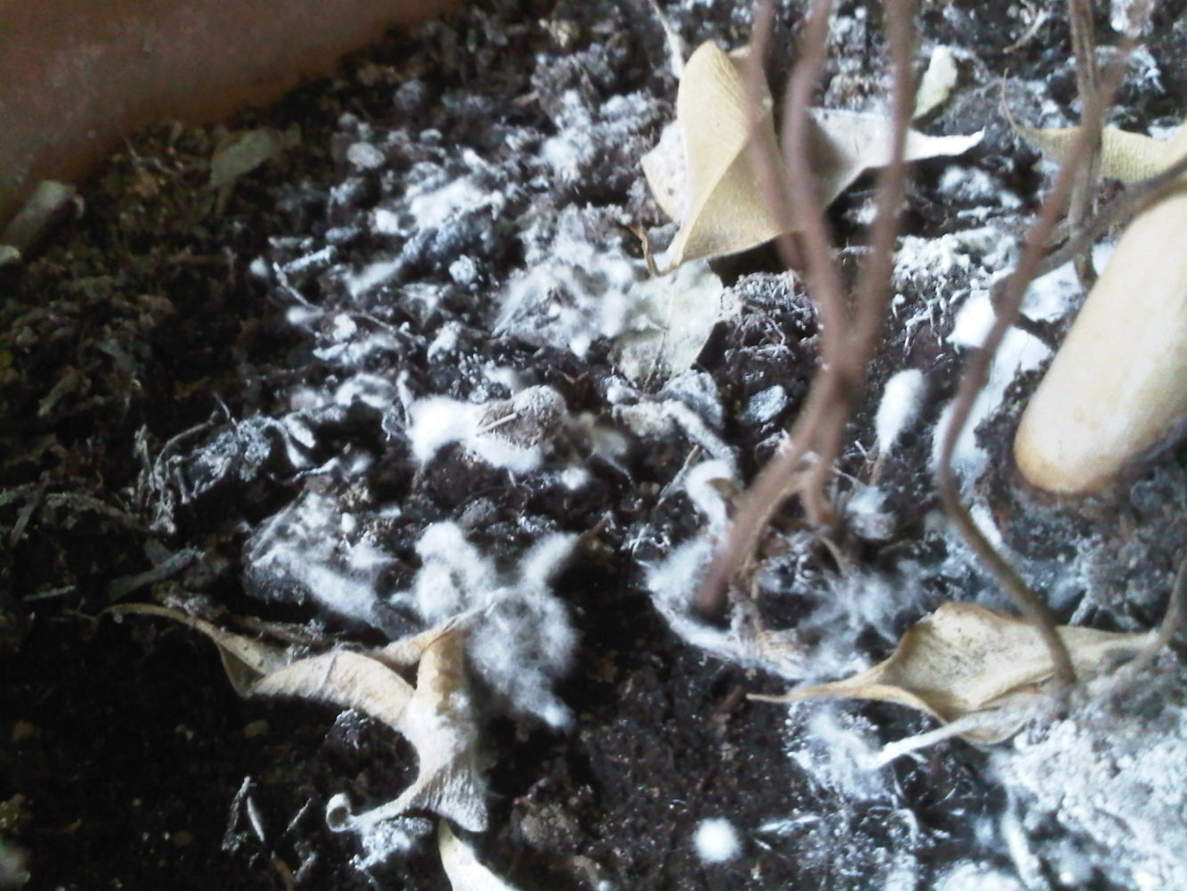 bei zwei meiner vor ca. einer Woche umgetopften Pflanzen(Bananenbäume: Musa Basjoo) befindet sich weißer Belag auf der Erde. Die Pflanzen hatte ich vom gleichen Anbieter, vor dem Umtopfen war jedoch nichts dergleichen zu erkennen. Alle anderen Pflanzen die ich vor ca. 3 Wochen mit der gleichen Erde(=gleiche Firma) aber nicht den gleichen Beuel umgetopft habe, weisen keine Probleme auf.