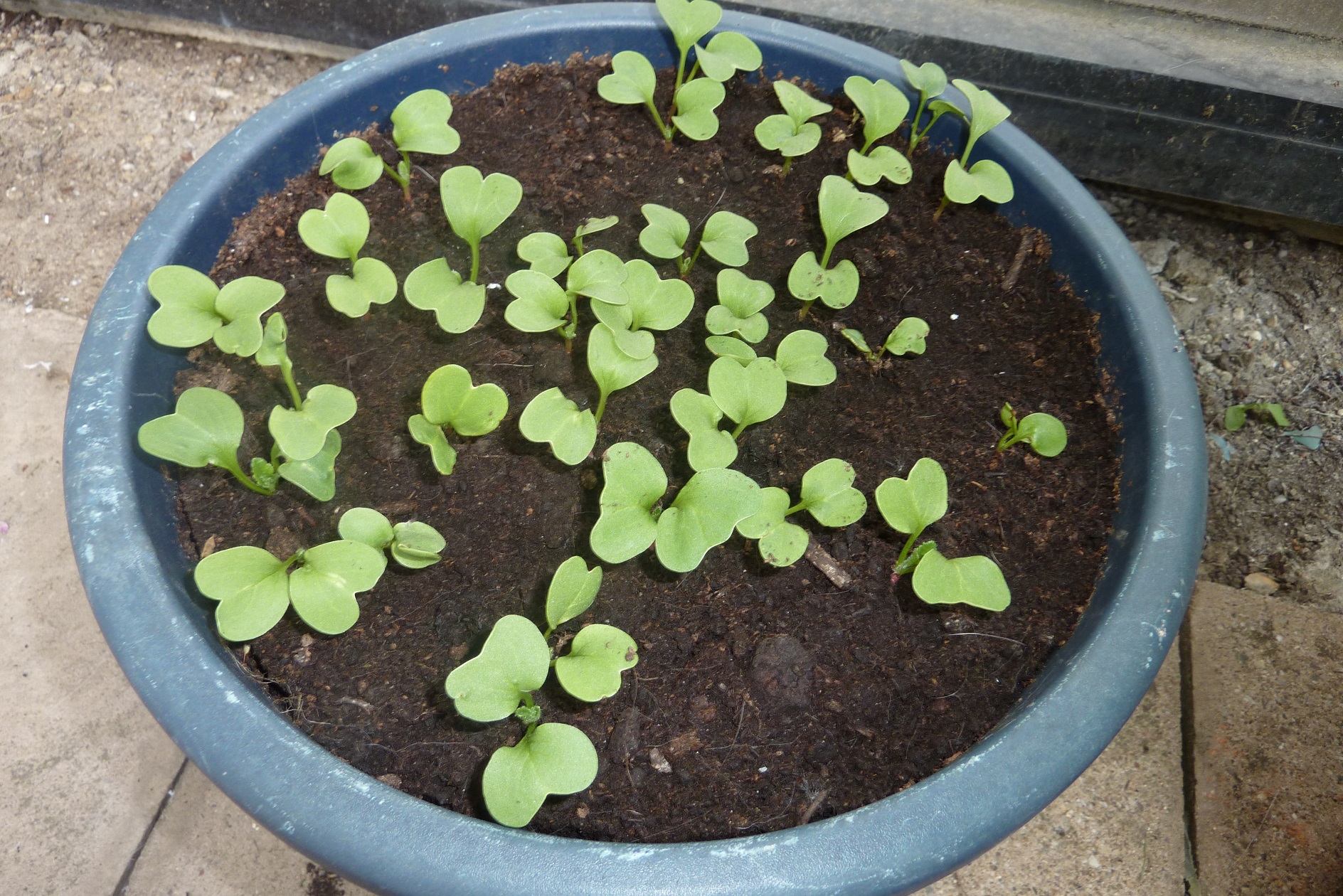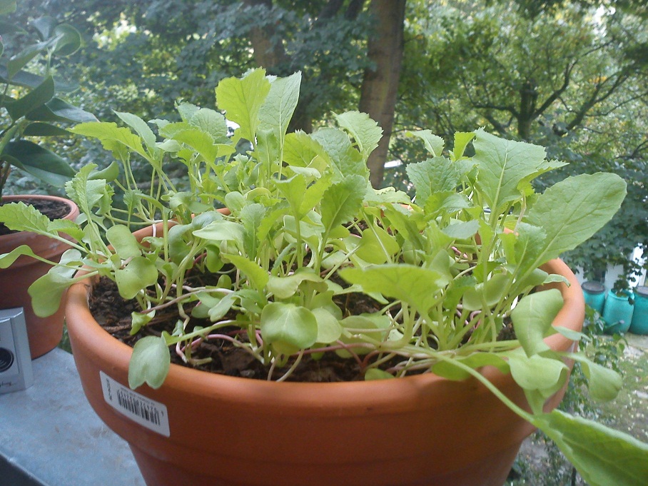 Aber was für mich am deutlichsten erkennbar ist, ist das Gedränge im Topf. Stand auf der Tüte nichts von Standweiten und Abständen? Einer Radieschenpflanze sollten zum Gedeihen mindestens 30 cm² zur Verfügung stehen, im Sommer, im Herbst mehr. Das hat auch nochmal was mit dem Licht zu tun. Die Pflanzen stellen ihre Blätter so, dass sie sich nicht gegenseitig beschatten und sammeln damit so viel Sonnenenergie wie geht um sie in die Knolle einzulagern.