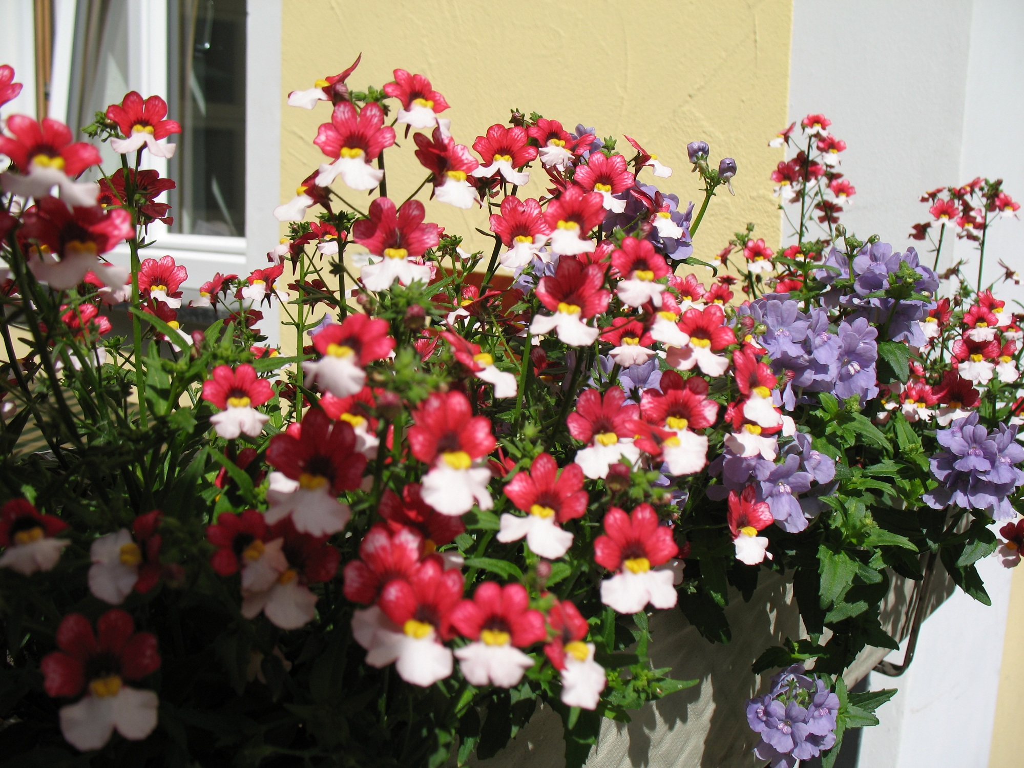 ich habe in einem Blumenkasten die folgenden Blumen gesehen und würde diese gerne auch bei mir anpflanzen. Kann mir jemand sagen, worum es sich dabei handelt (sowohl die rot-weiße als auch die blauen Blumen)? Und sind die für einen Balkonkasten auf der Südseite geeignet?