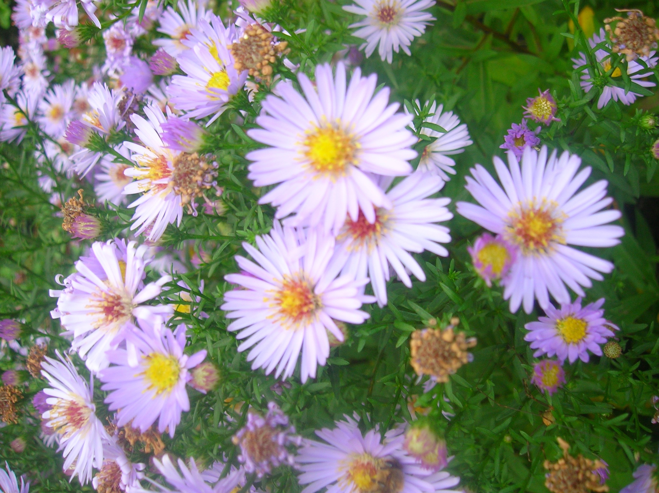 Sie blühen in lila, haben viele blüten, und stehen jetzt gerade in voller blüte. Sie wachsen in einem art busch, also nicht einzeln, so wirkt es zumindest.