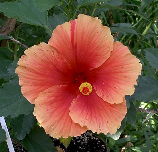 Der "E"-Sämling ist schließlich der enttäuschendste der Fünflinge. Die Blüte ist lediglich 15 cm groß und farblich unspektakulär. Zudem ist er blühfaul und im Vergleich zu den Geschwistern ein Schwächling. Dieser stand schon auf der Abschußliste, hat aber dann doch noch ein Plätzchen im Winterquartier gefunden. Ich werde ihn aber nicht vermehren.