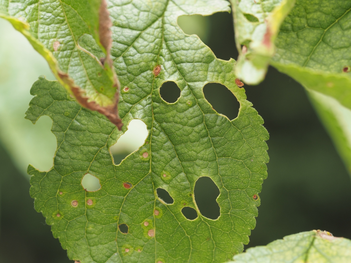 Meine Pflaume bekommt überall braune Flecken, erst kleine Punkte, die sich dann vergrößern und große Teile des Blattes absterben lassen. Später fällt das abgestorbene Material heraus und Löcher bleiben zurück. Worum kann es sich hier handeln?