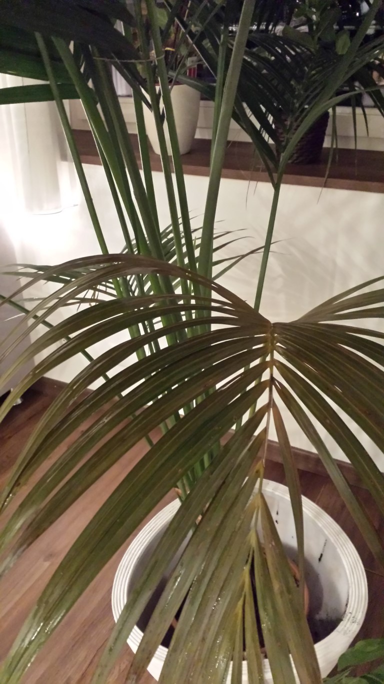 Die Palme wurde nicht umgetopft und hatte im Mai einen Thripsenbefall. Da mehrmaliges abwaschen nichts half, habe ich einen Google Rat befolgt und die Palmwedel mit einer Olivenöl-Spülmittel-Wasser Gemisch besprüht, ich denke dies war der Fehler. Als ich einen Monat später aus dem Urlaub zurückkam (die Palme wurde in der Zwischenzeit einmal pro Woche gegossen) hatten so ziemlich alle Wedel verdorrte Stellen.