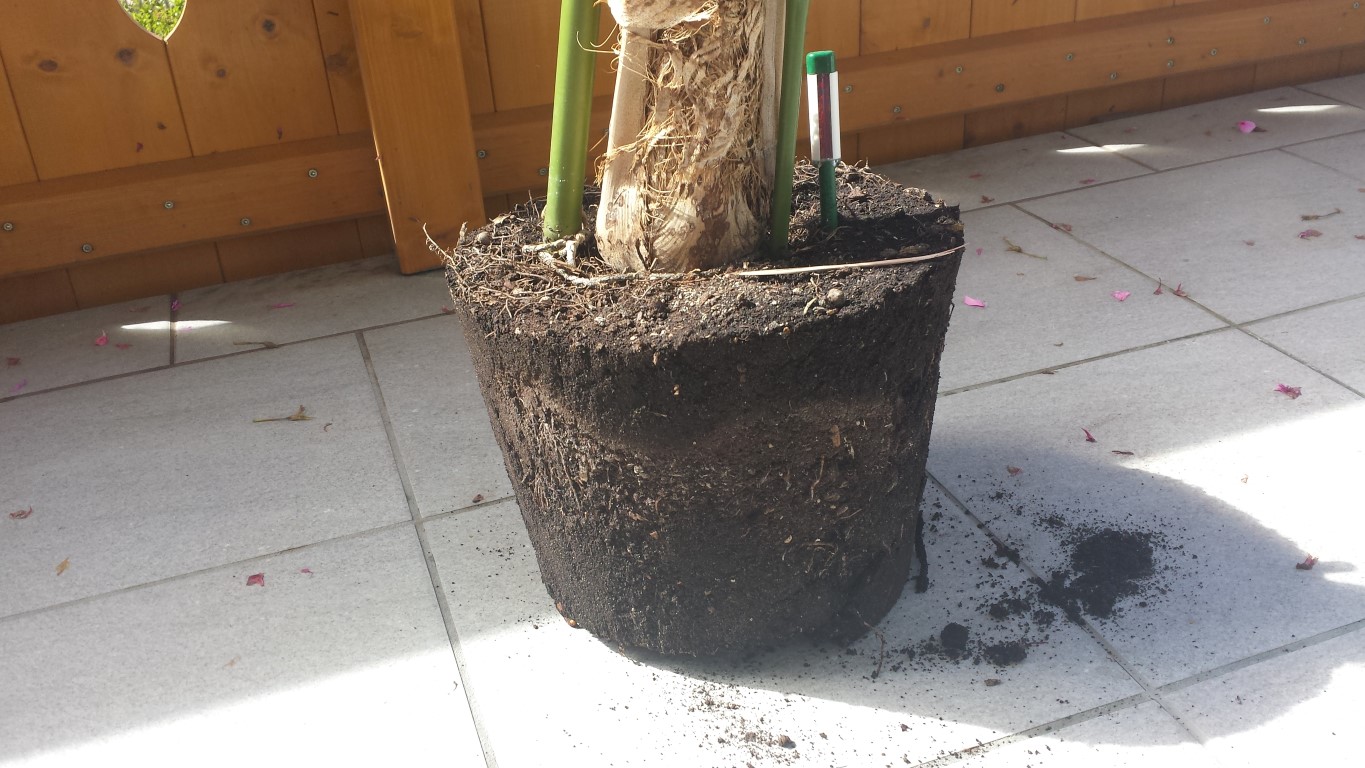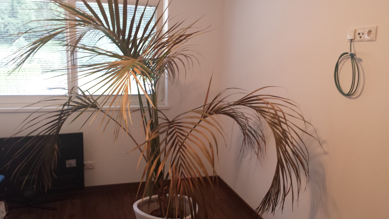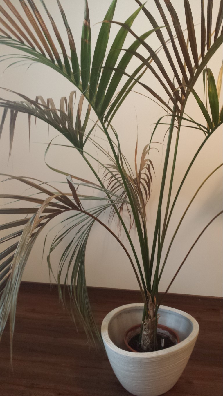 Die Palme wurde nicht umgetopft und hatte im Mai einen Thripsenbefall. Da mehrmaliges abwaschen nichts half, habe ich einen Google Rat befolgt und die Palmwedel mit einer Olivenöl-Spülmittel-Wasser Gemisch besprüht, ich denke dies war der Fehler. Als ich einen Monat später aus dem Urlaub zurückkam (die Palme wurde in der Zwischenzeit einmal pro Woche gegossen) hatten so ziemlich alle Wedel verdorrte Stellen.