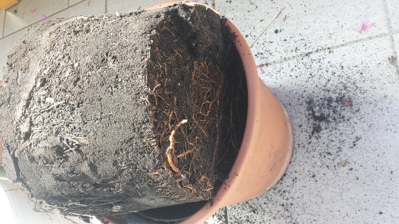 Anbei Fotos vom Wurzelballen, er scheint fest zu sein. Die Wurzeladern sind bereits an der Oberfläche zu sehen, ist dies ein Indiz dass der Topf zu klein ist?