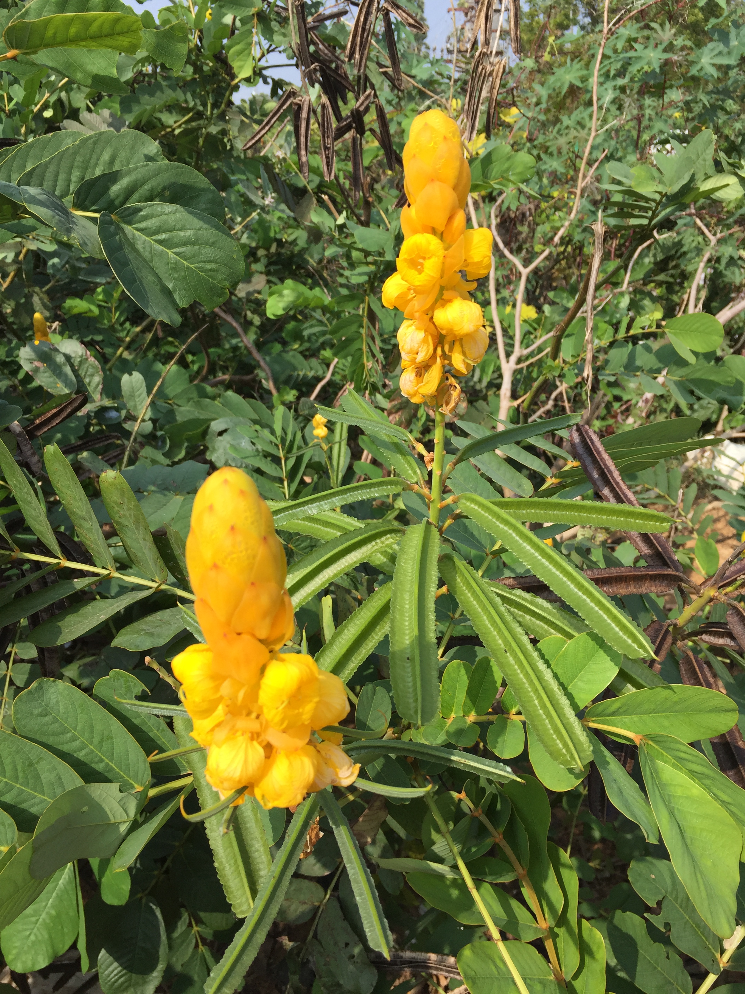 diese Pflanze habe ich beim Urlaub in Südindien entdeckt. Die Schoten färben sich von grün zu braun und enthalten dreieckige Samen. Weiss zufällig jemand was das für eine Pflanze ist?