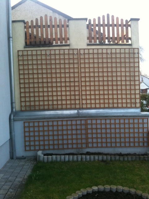 das Rankgitter sieht doch perfekt für einen Blauregen aus. Dieser rankt sehr schnell, ist winterhart und blüt wünderschön üppig und blau im Sommer.