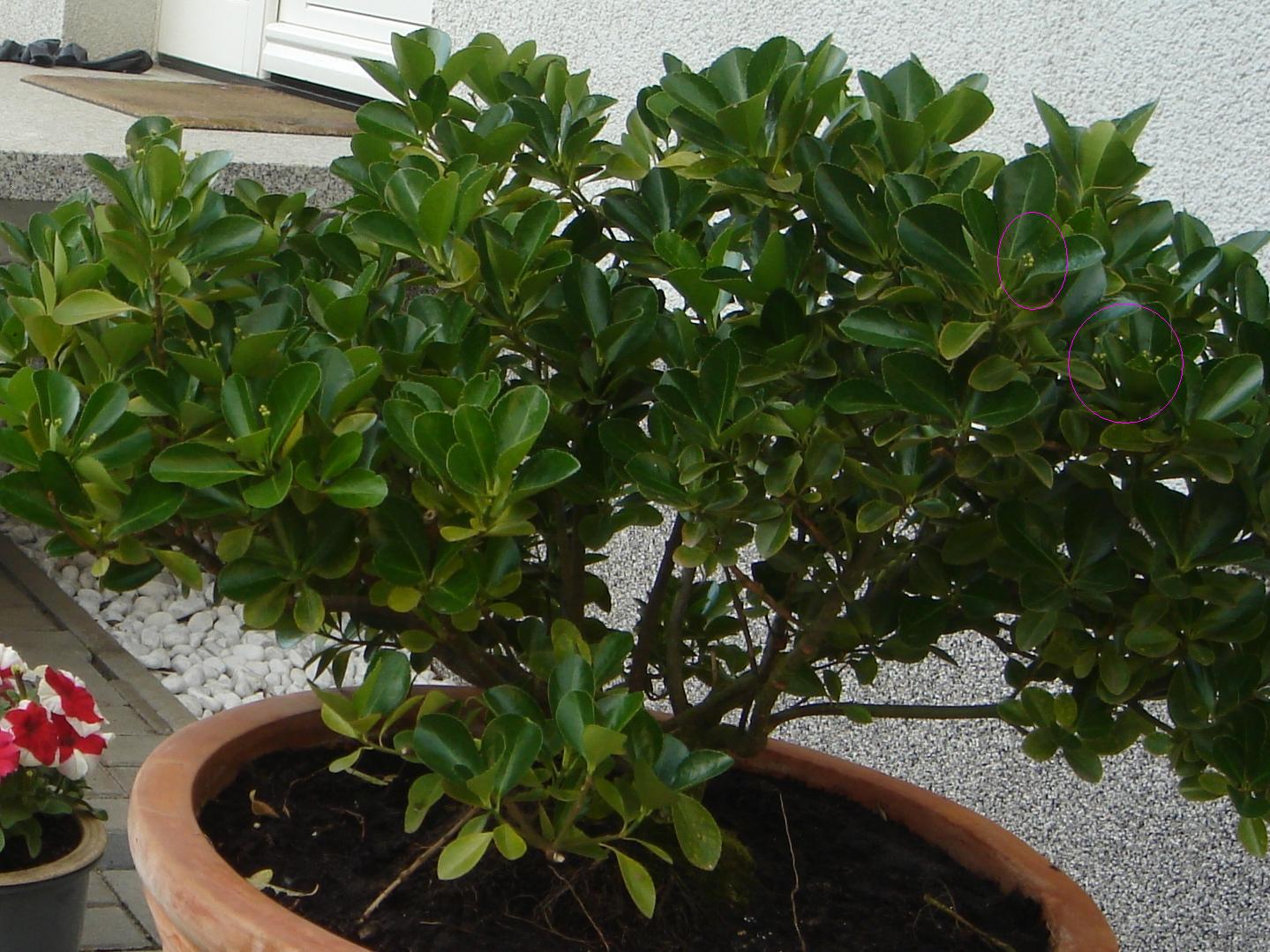 kann mir jemand sagen, welche Pflanze ich hier habe ? Sie hat kleine weiße Blüten, im Moment Knospen. Hab sie auf dem Bild eingekreist. Hab immer Probleme mit gelben Blättern. Hab sie in der vollen Sonne stehen.