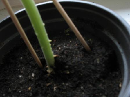 aus den Samen dieser Pflanze sollte sich eigentlich ein "Lacebark-Flammenbaum" (Brachychiton discolor) entwickeln. Inzwischen habe ich da aber so meine Zweifel. Zum einen erinnert die Wuchsform eher an eine Kletterpflanze als an einen Baum, zum anderen hat sie Ranktriebe entwickelt, die sich um andere Pflanzen wickeln, sobald welche in ihrer Nähe sind. Außerdem hat sie mittlerweile kleine Dornen am unteren Stammende. Sie ist jetzt ca. 2 Monate alt und schon über 50 Zentimeter.