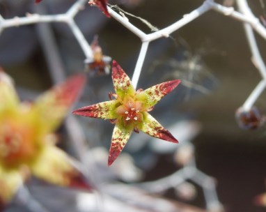 also mir reicht das Foto . Die Pflanze ist nicht vom afrikanischen Kontinent sondern ein Mexikaner mit dem Namen Graptopetalum pentandrum. Das ist so eindeutig, weil es nur ein einziges Graptopetalum gibt, das nur fünf Staubblätter hat, alle anderen haben 10. Die Blütenfärbung und die Verzweigung des Blütenstandes, die man im Hintergrund erkennen kann, tun dann ein Übriges um diesem Foto einen Namen geben zu können.