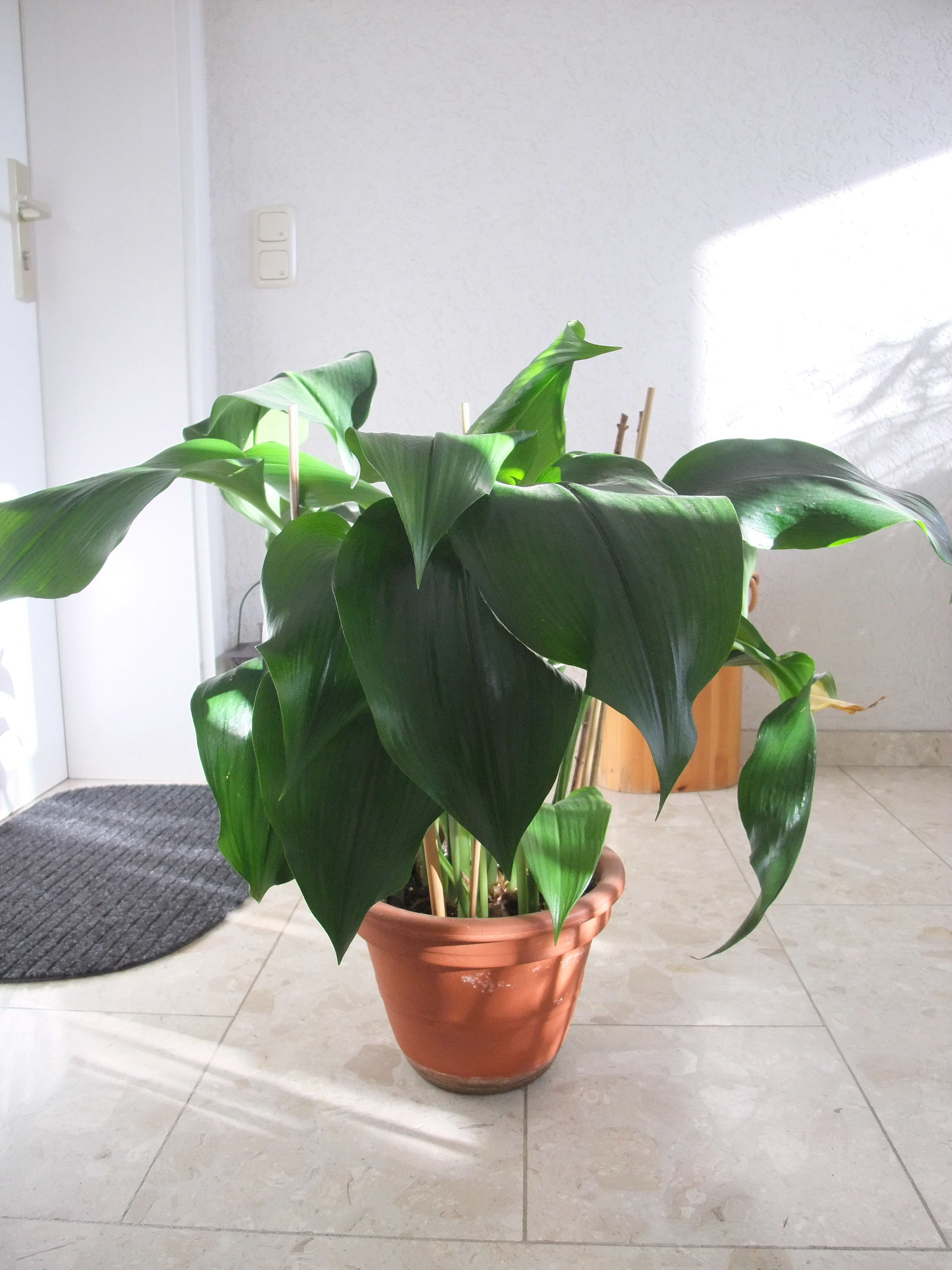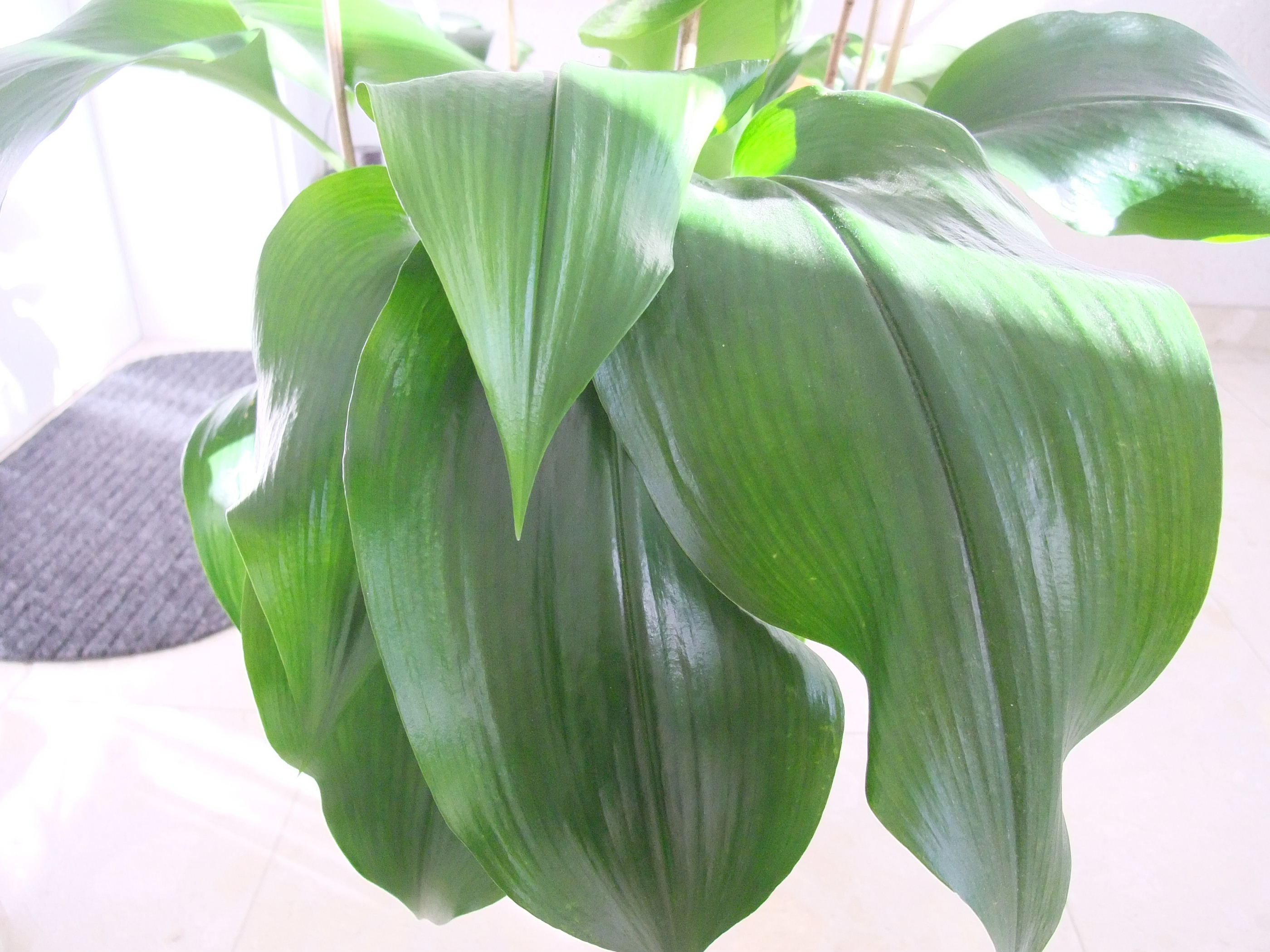 Die einzige Pflanze, die ich gefunden habe, die meiner am nächsten kommt, ist die Schusterpalme. Die Richtung der Blattadern stimmen und an jedem Stiel ist auch nur ein Blatt. Aber irgendwie sieht es auf den Bildern eher so aus, als bestünde die Schusterpalme fast nur aus Blättern ohne viel Stiel. Die Blätter sehen zudem nicht so formstabil aus wie bei meiner Pflanze. Ich bin so verwirrt...