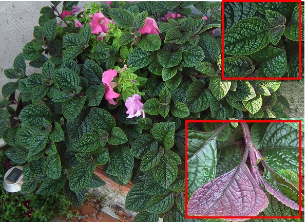 Ich habe von meinem Schwager die Pflanze (auf dem Bild) bekommen. Sie sieht sehr schön aus. Die Blattoberseite ist dunkelgrün und die Unterseite und auch die Stengel sind violett. Die Vermehrung erfolgt durch Kopfstecklinge. Mehr weiß ich leider nicht.