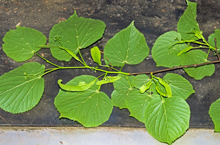 Ich habe ein Bild eines Zweiges mit Blätter und Fruchtansatz, auf den ersten Blick wie eine Linde,