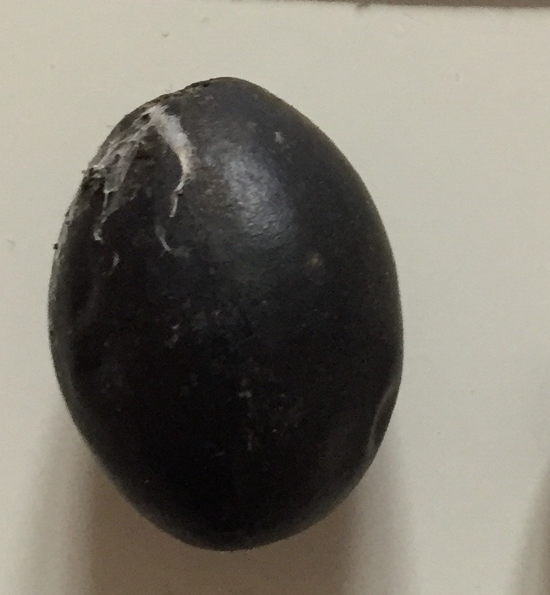 Die Frucht sieht auf den 1. Blick wie eine schwarze Olive aus - auch von der Größe her - und "blutete" weiß an der Pflückstelle.