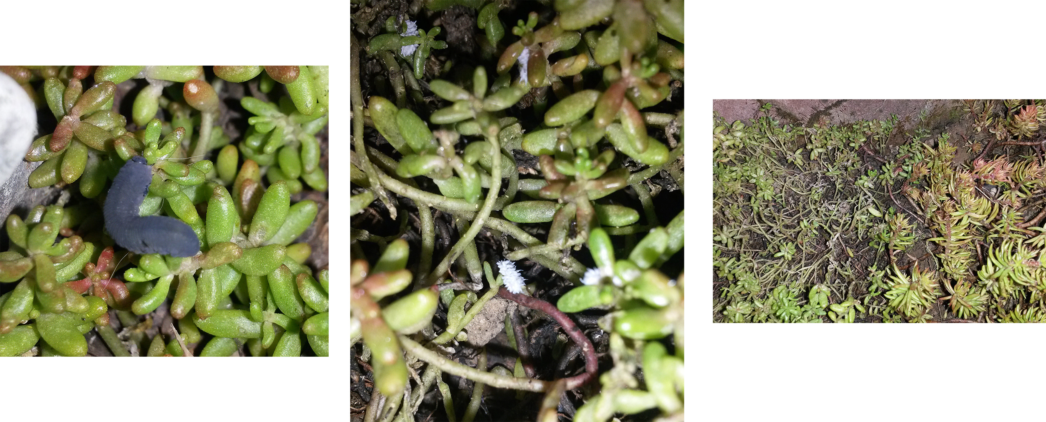 Auf zwei solcher "Teppiche" hab ich nun seit kurzem immer mehr Fraßstellen festgestellt, d.h. der Teppich wird immer löchriger und die dicken runden Blattkügelchen zerbröseln beinah in den Händen.