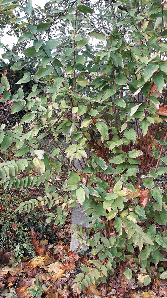 Das erste Foto zeigt den Strauch im Juni während der Blütezeit, das Zweite im Oktober.