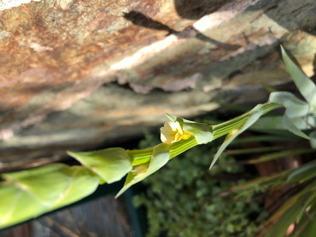 Blüht in Rispen gelb, ich dachte es sei eine Iris, konnte aber nichts dazu finden. Ist wintergrün und kann in unseren Wintern auch erfrieren. Denke Z7 - Z8, an was ich mich noch erinner.