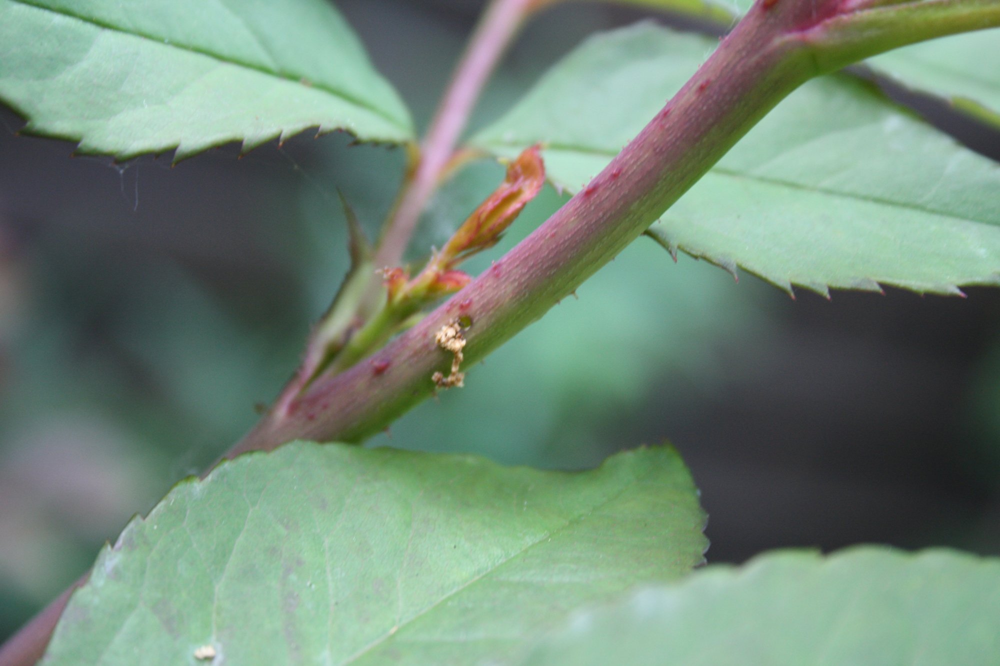 An meiner Rose sind mir im Stengel Minibohrlöcher aufgefallen, unter dem Loch hängt das rausgeborte spiralförmig raus.