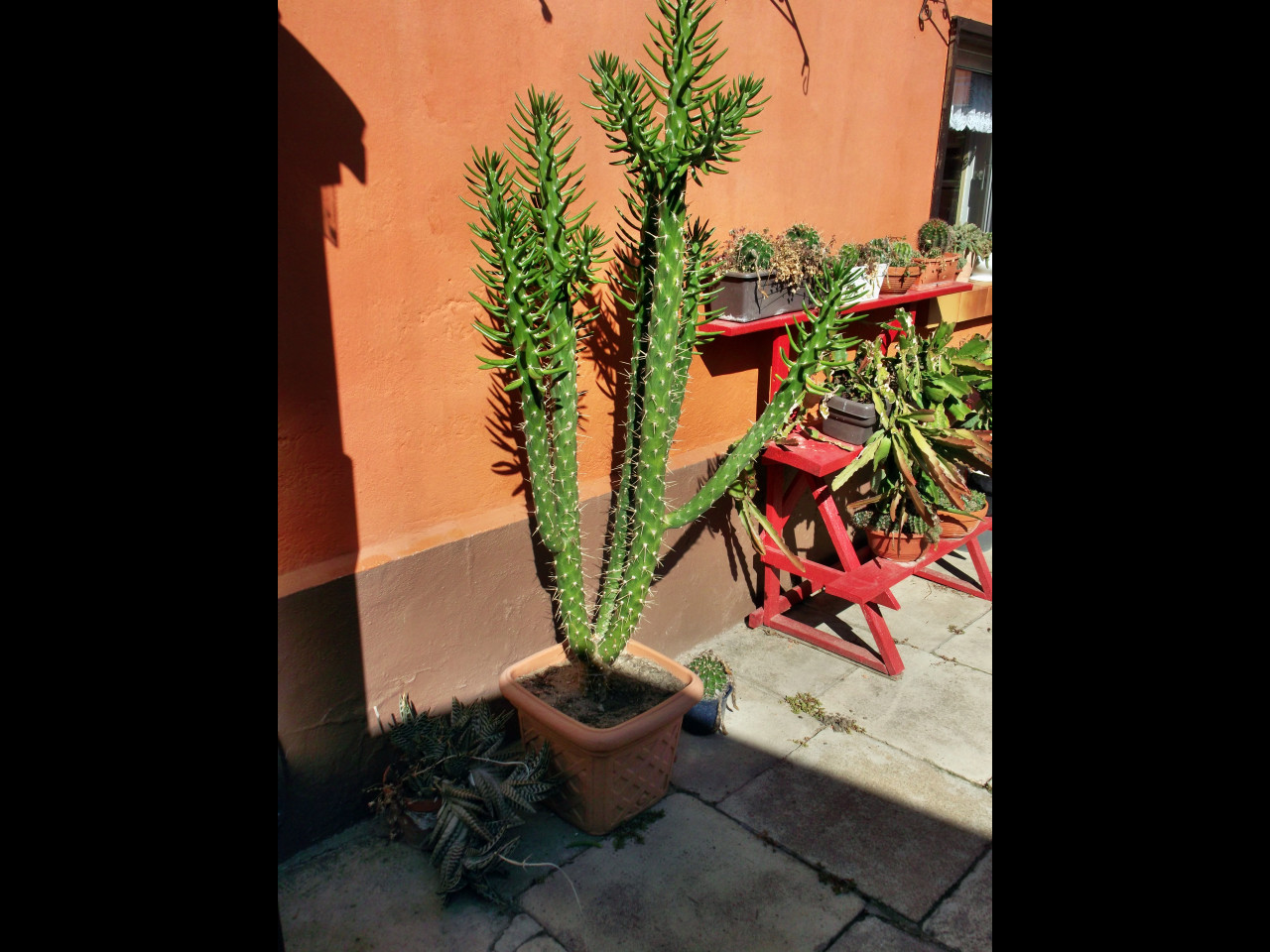 Hast du vielleicht sonst noch zwei länglich hohe Kisten/ ehemalige Pakete? Dann könntest du die Pflanze samt Topf in die eine Kiste stellen, dann eben die stacheligen Teile "entschärfen" (vllt. mit Styropor oder ähnlichem) und dann noch mal eine Kiste drüber stülpen. Sie würde ja sicher auch nur für den Transport so verpackt werden und nicht länger so rumstehen?