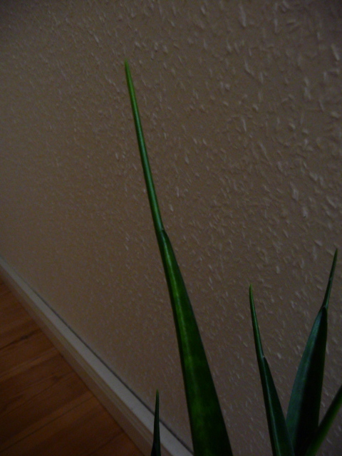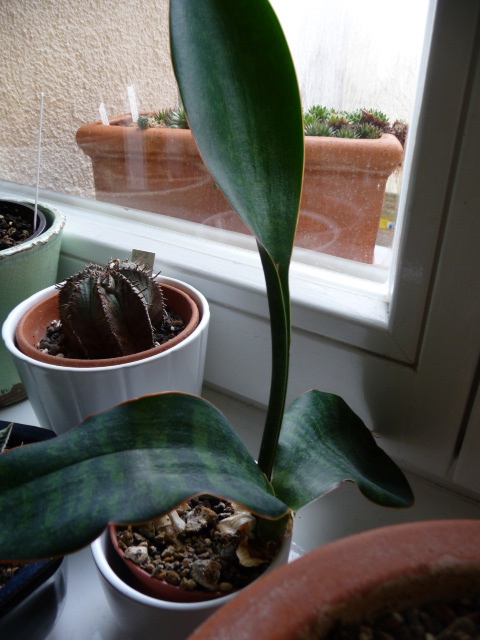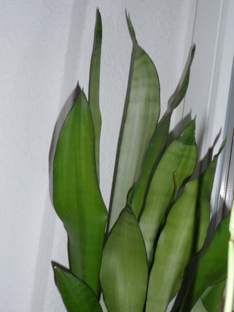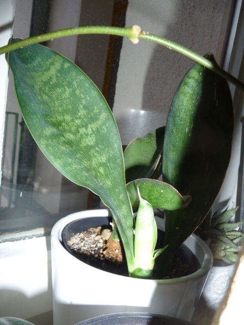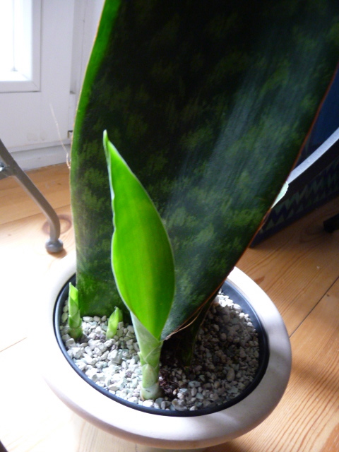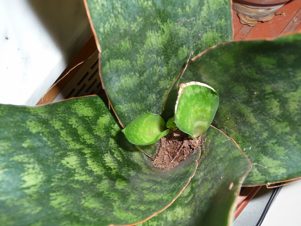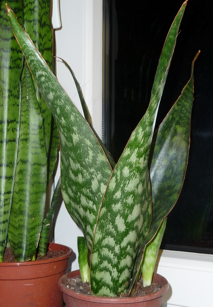 Eigentlich wäre mir der genaue Name ja nicht so wichtig, Hauptsache sie wächst. Sie macht derzeit einige Bodentriebe, aber, siehe da: Das Blattmuster ist anders. Sie bildet eher die bei vielen grünen Arten üblichern Querbänder aus als die getrennten Flecken auf den bisherigen älteren Blättern und hat auch noch nicht den trockenen Rand.