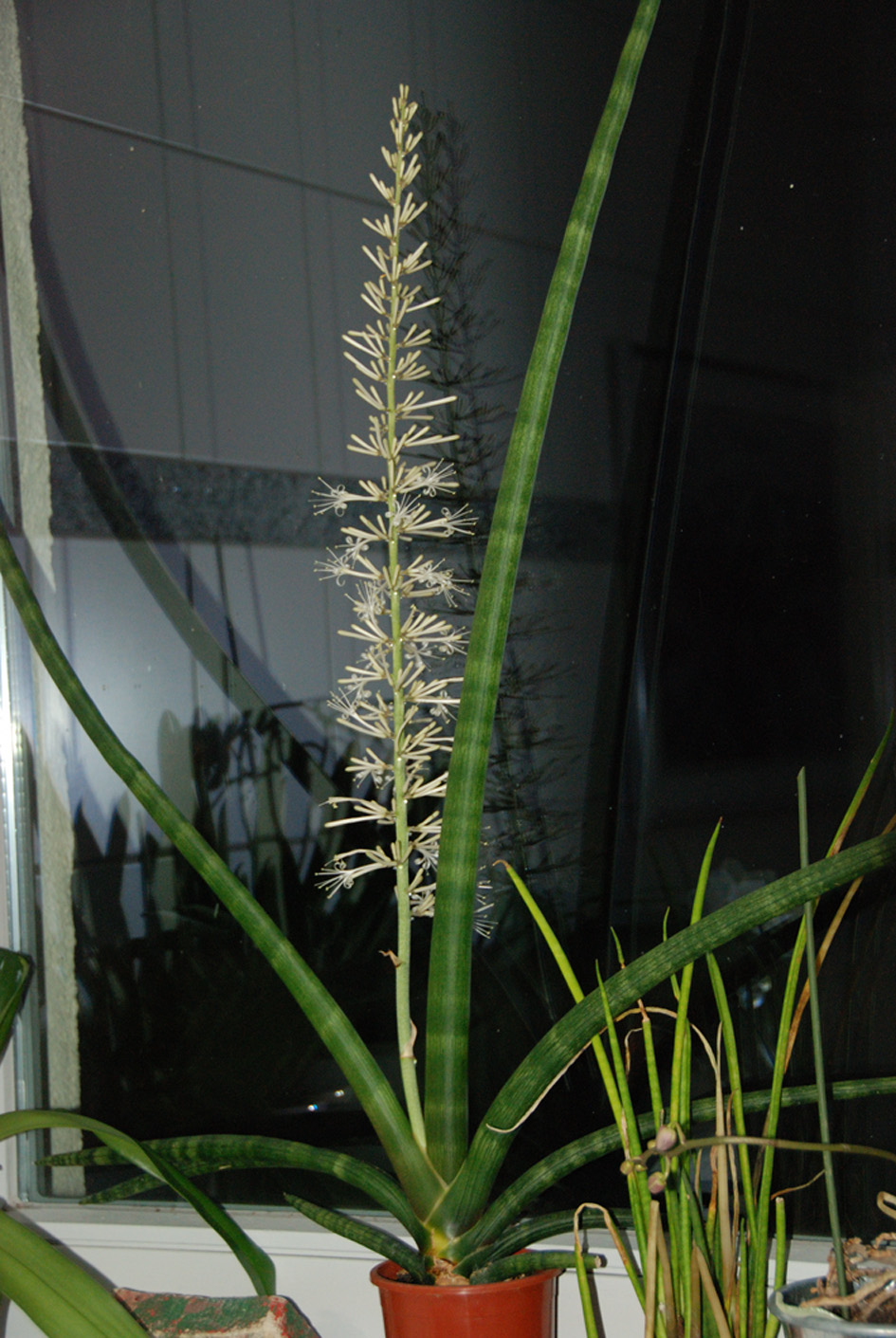 Und als die kleine Sanse zutraulich geworden war - was eine ganze Weile gedauert hatte - da fing sie an zu wachsen und zu wachsen und zu wachsen und wurde immer größer, und dann bekam sie einen Platz im Badezimmerfenster, wo es sehr hell und warm und feucht ist, gleich neben der Dusche, und sie wurde noch größer. Und nun hat sie im Eiltempo einen Blühstengel herausgetrieben und die Blüten sind heut aufgegangen, und nun am Abend riecht schon das Bad erotisierend wie ein orientalisches Freudenhaus…