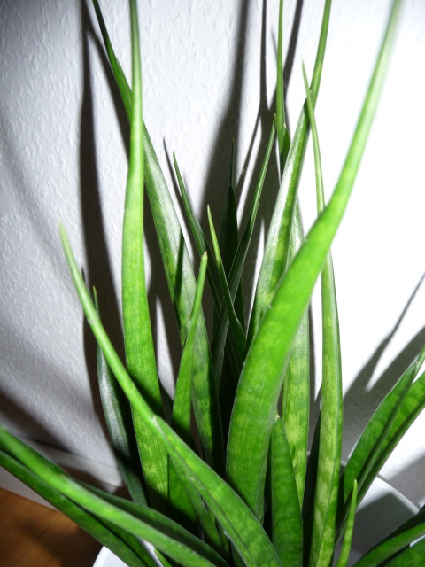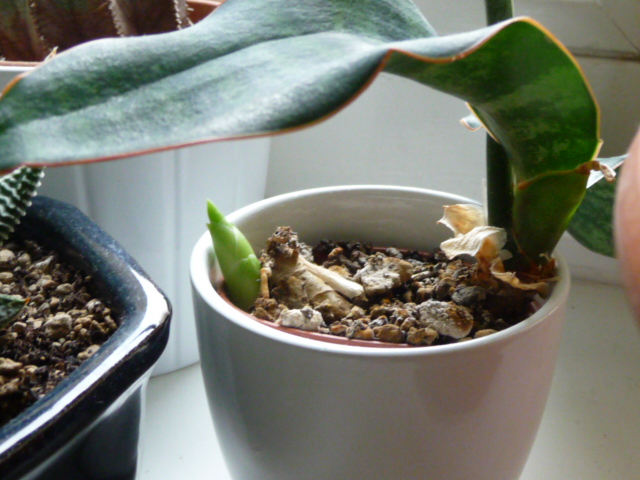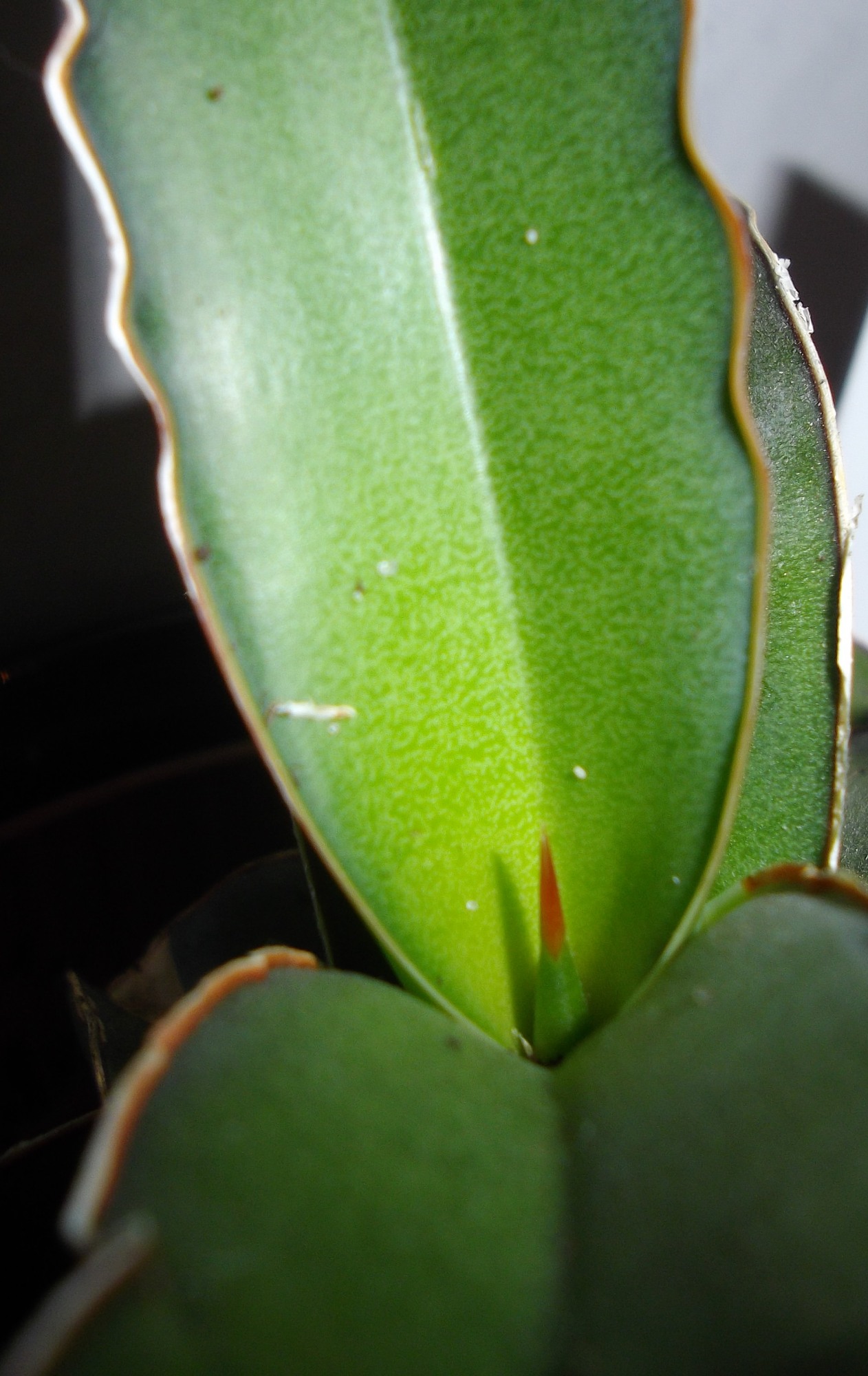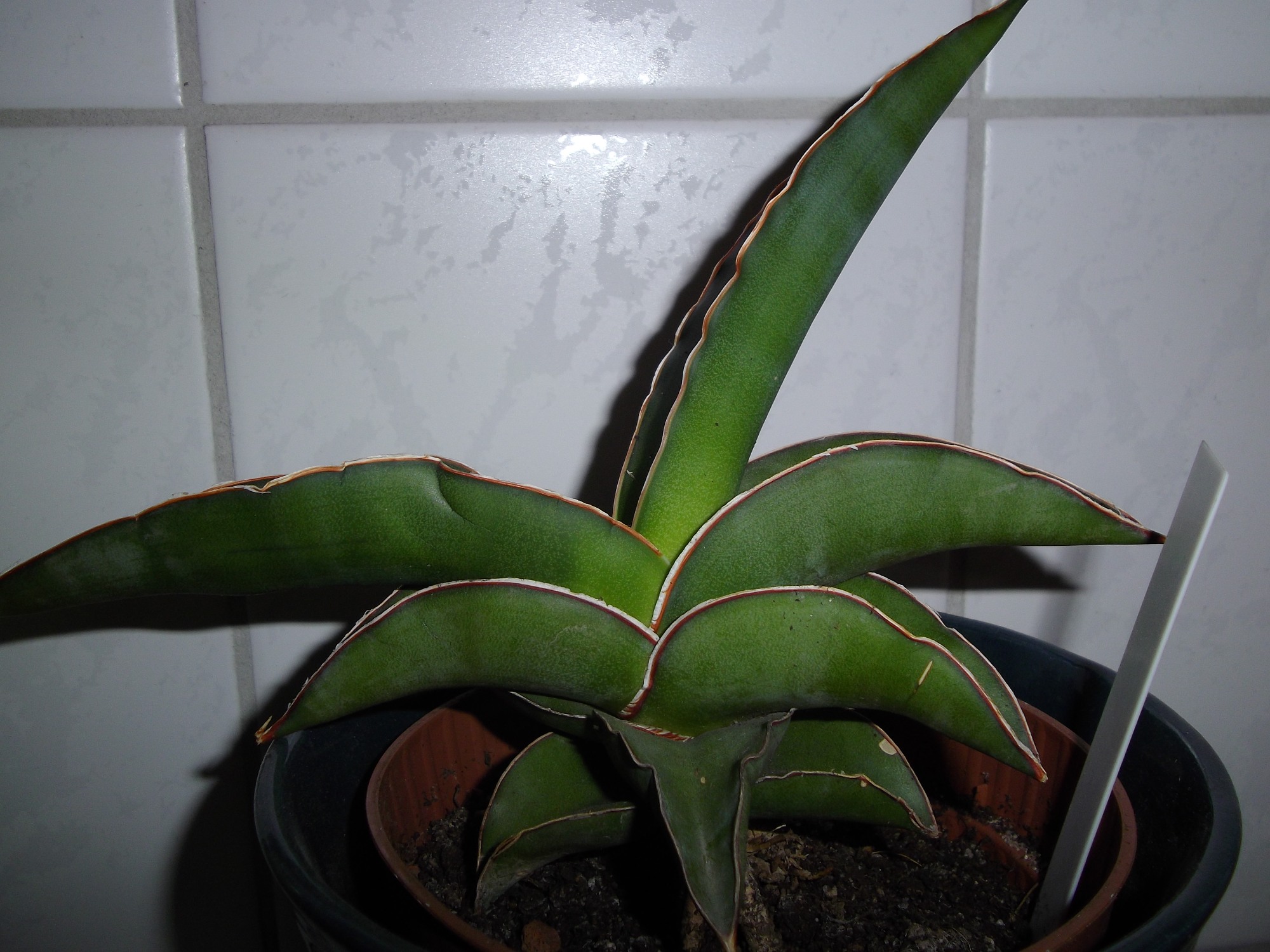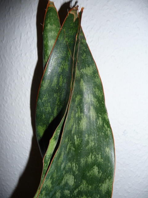 Eigentlich wäre mir der genaue Name ja nicht so wichtig, Hauptsache sie wächst. Sie macht derzeit einige Bodentriebe, aber, siehe da: Das Blattmuster ist anders. Sie bildet eher die bei vielen grünen Arten üblichern Querbänder aus als die getrennten Flecken auf den bisherigen älteren Blättern und hat auch noch nicht den trockenen Rand.