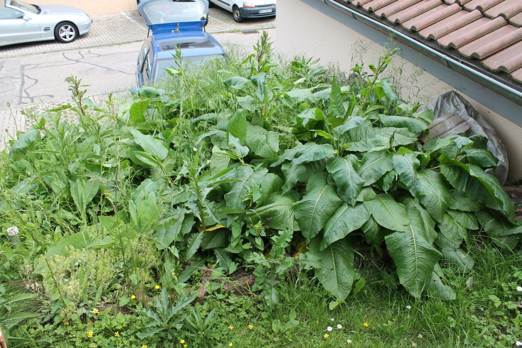 ...den Namen einer Pflanze zu bestimmen. Sie ist von kräftigem Wuchs, wächst mit großen glänzenden Blättern. Sie vermehrt sich ohne mein Zutun rasant und wird sehr hoch, fast 1 Meter. Konnte aus Krankheitsgründen eine Zeitlang den Garten an dieser Stelle nicht kultvieren, da ist sie mir über den Kopf gewachsen. Die Blätter erinnern mich an wilden Meerrettich, riecht aber nicht danach. Die Wurzeln sind ungelogen fast 20 cm und länger, Daumendick und waren nur durch ausgraben mit dem Spaten zu beseitigen. Die im Boden verbliebenen Restwurzeln beginnen indessen wieder auszutreiben.