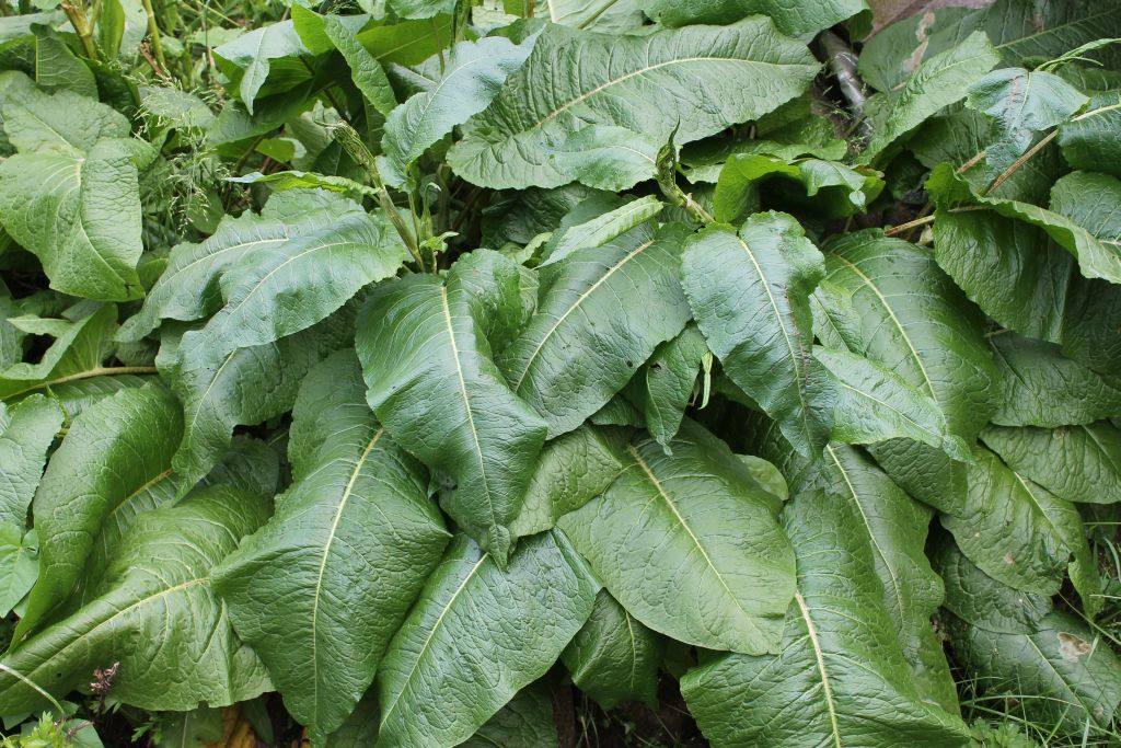 ...den Namen einer Pflanze zu bestimmen. Sie ist von kräftigem Wuchs, wächst mit großen glänzenden Blättern. Sie vermehrt sich ohne mein Zutun rasant und wird sehr hoch, fast 1 Meter. Konnte aus Krankheitsgründen eine Zeitlang den Garten an dieser Stelle nicht kultvieren, da ist sie mir über den Kopf gewachsen. Die Blätter erinnern mich an wilden Meerrettich, riecht aber nicht danach. Die Wurzeln sind ungelogen fast 20 cm und länger, Daumendick und waren nur durch ausgraben mit dem Spaten zu beseitigen. Die im Boden verbliebenen Restwurzeln beginnen indessen wieder auszutreiben.