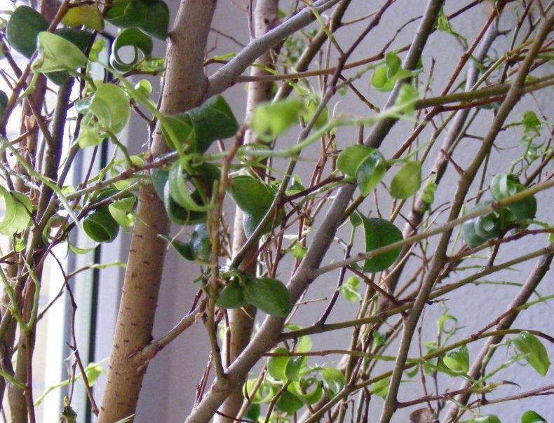 Als ich ihn bekommen habe war er ca. 30cm hoch und hatte 3 ca. 1cm dicke Stämme im Topf. Er hatte damals 1-2 cm sehr schöne ovale gebogene Blätter. Beim verschneiden des Baumes, ist mir aufgefallen, dass er eine weiße klebrige Flüssigkeit absondert. Somit schlußfolgere ich, dass es sich um eine Gummibaumart handeln muß.