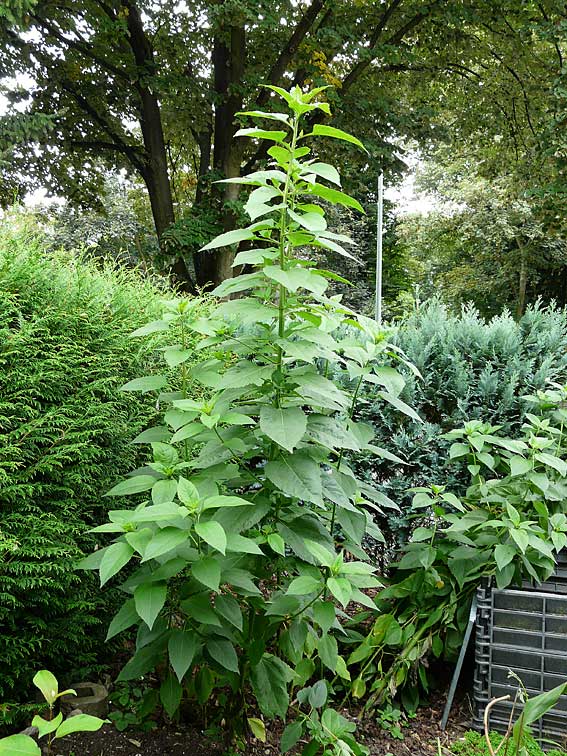 in unserem Garten gibt es ein paar sehr große Pflanzen (die größte hat ca. eine Höhe von 2,5 m), bei denen es mir nicht gelungen ist sie zu bestimmen. Sie erinnern mich an Sonnenblumen, nur das sie keinen erkennbaren Ansatz für Blüten haben. Stiel und Blätter sind behaart. Da einige der Pflanzen schon umgefallen sind, habe ich auch Bilder von den Wurzeln machen können, vielleicht hilft das beim Bestimmen der Pflanzen.