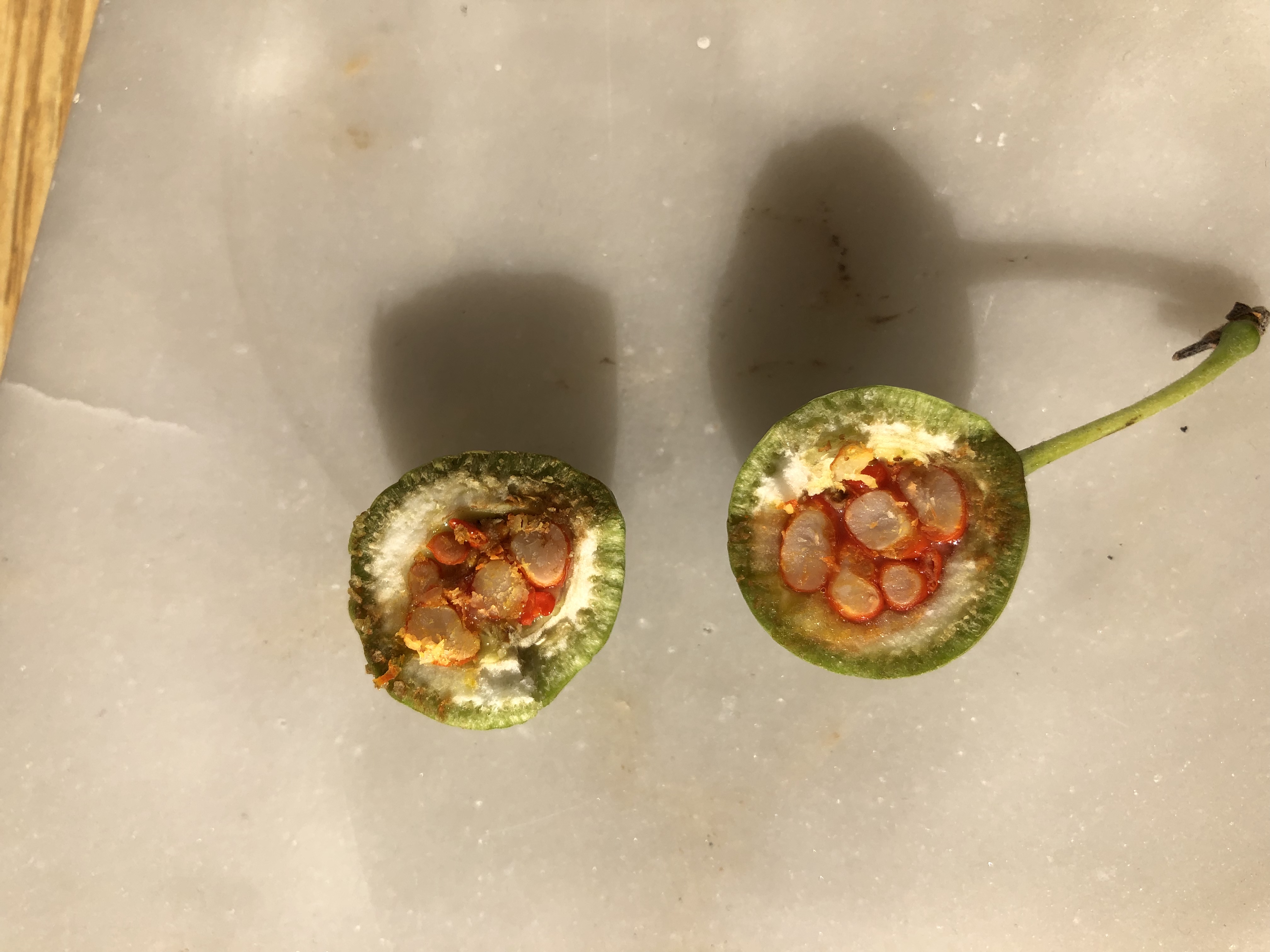 Es handelt sich um einen 2-3 meter hohen Baum. Die Innenseite der Früchte werden mit der Zeit rot.