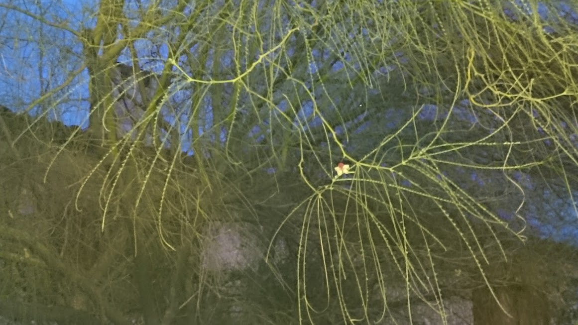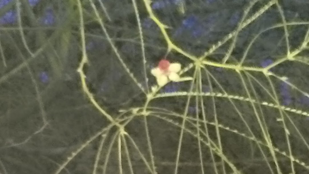 Großer Baum mit langen fadenartigen Blättern und einzelnen Blüten. Samenschoten lang und spitz zulaufend.