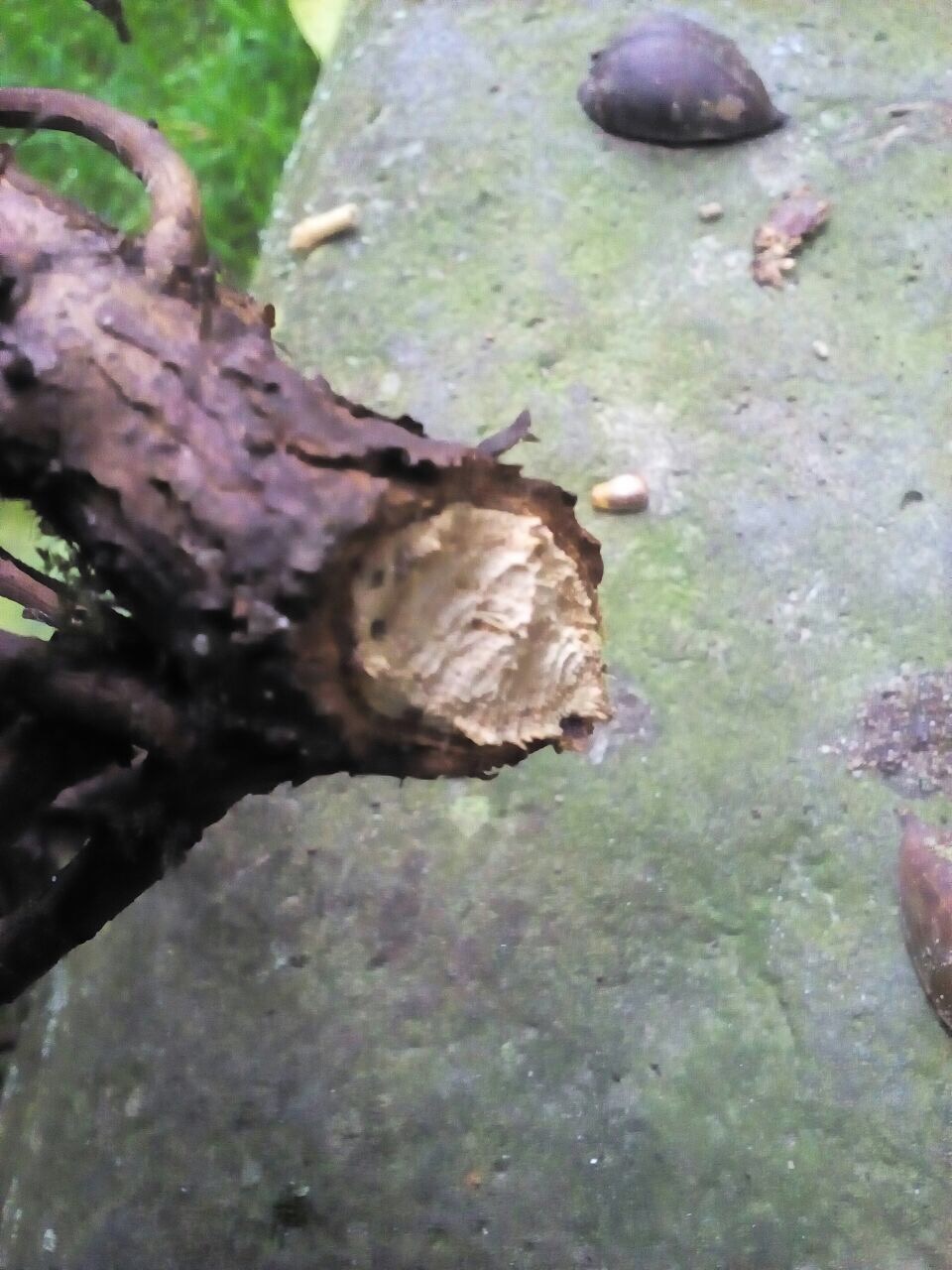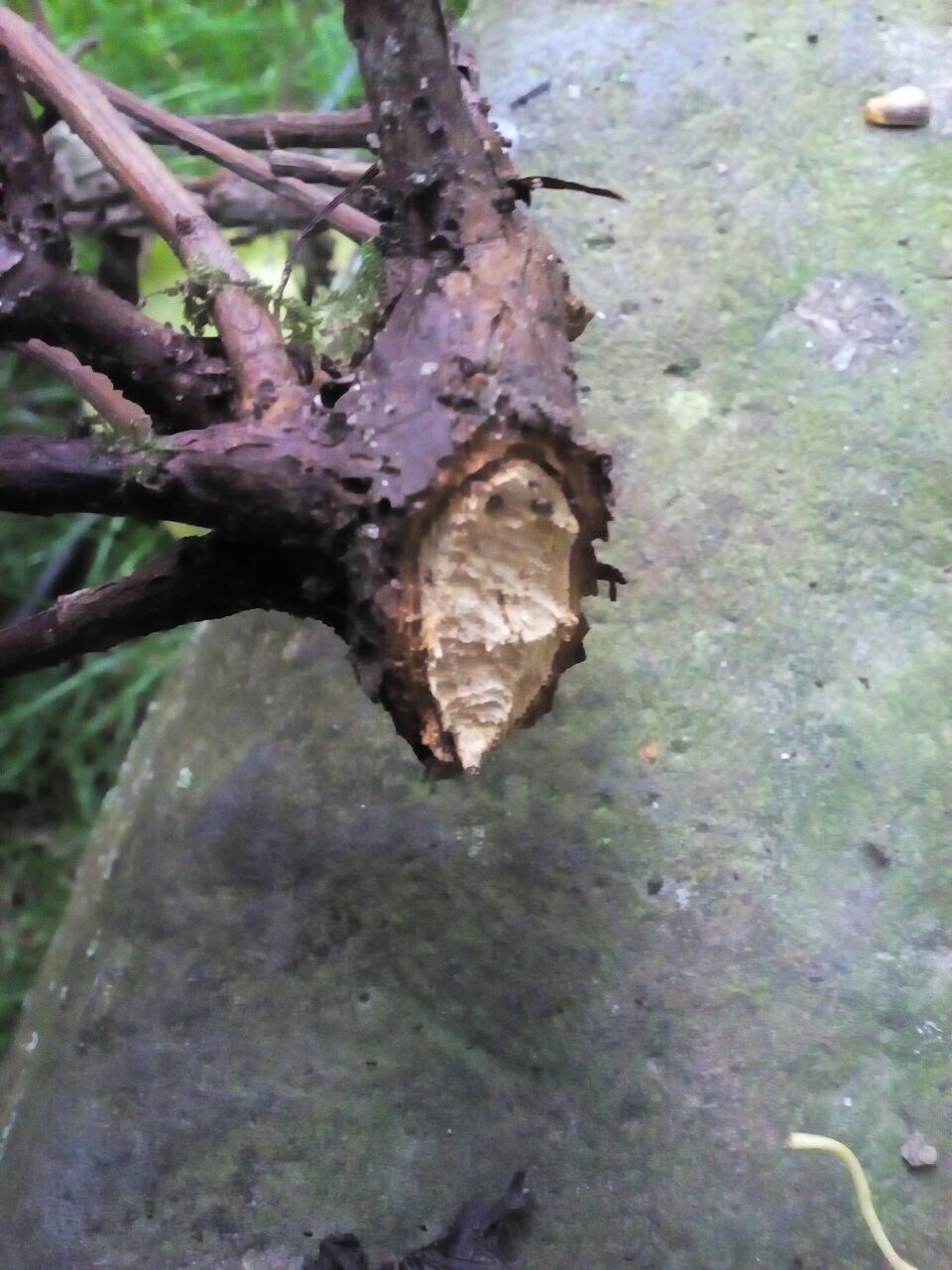 Nun wurde es aber gefällt, also der Stamm ist einmal schräg (schräg, wie wenn man mit einem Messer schneiden würde) durchtrennt, nicht ganz glatt und sauber aber auch nicht abgefranst wie abgerissen. Man könnte von Nagespuren sprechen ...