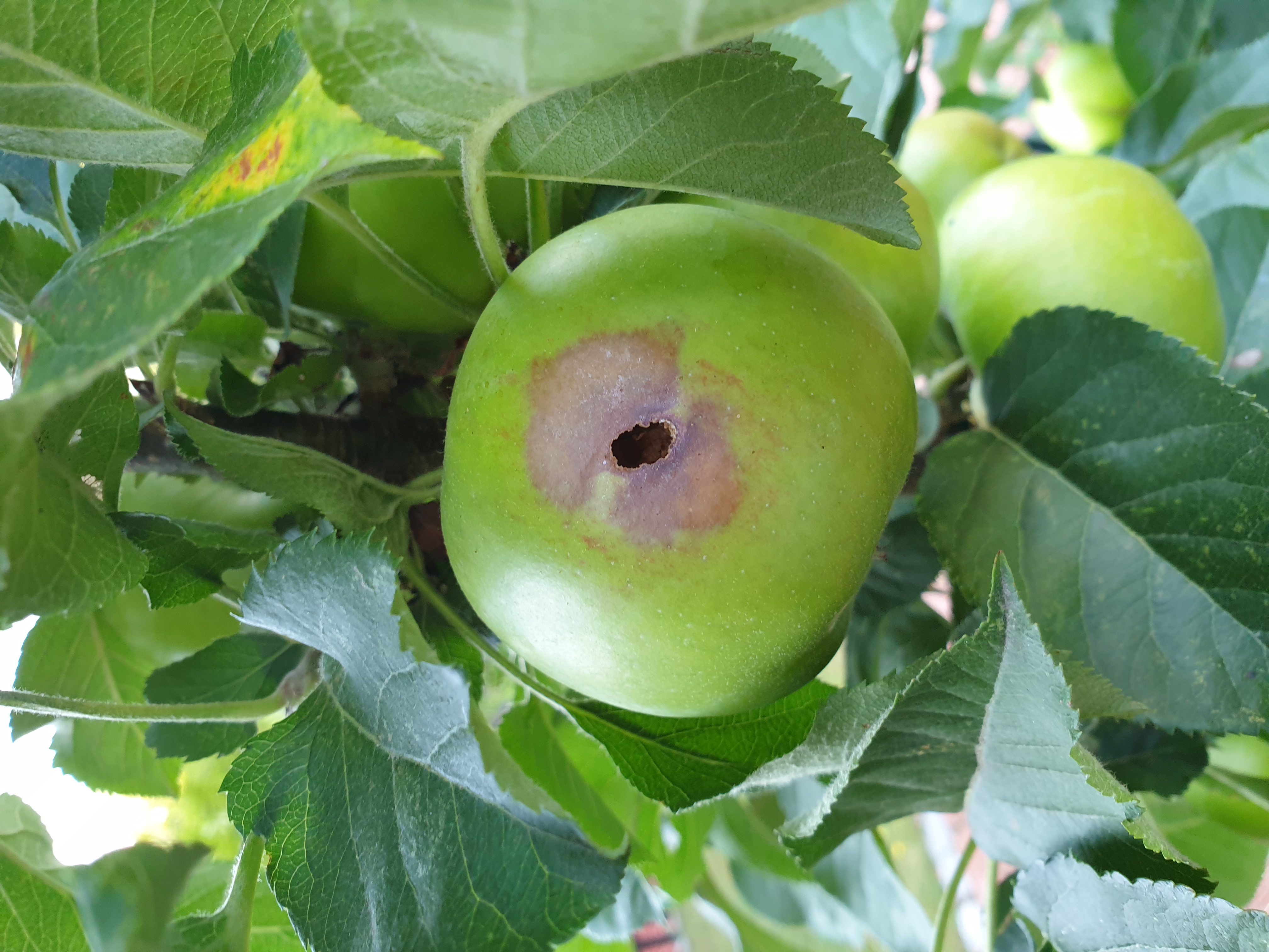 Doch was muss ich heute sehen? Etwa 10 Äpfel zeigen die gleichen Symptome: runde, braune Stellen/Löcher. Beim genaueren Hinsehen, konnte ich eine Wespe fressenderweise in einem Apel sehen. War es nur 1 Wespe, die sich von meinem baldigen Apfelkuchen nährt oder werden alle geschätzten 10 Äpfel oder bald noch mehr für ein Häusschen mit Nachwuchs missbraucht?