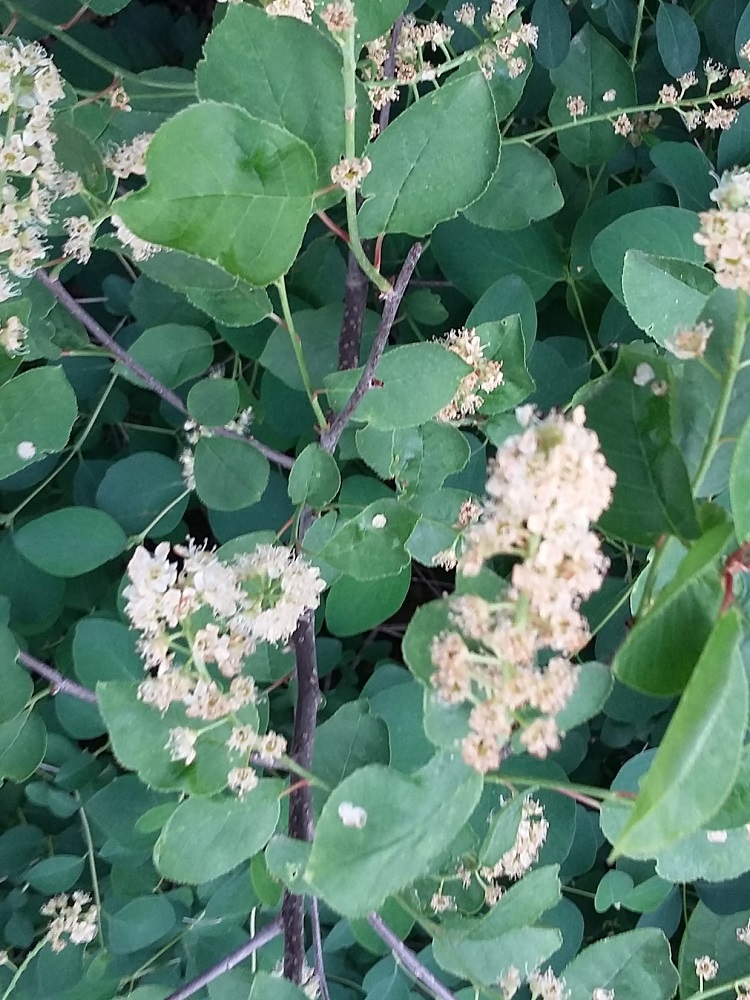 ich könnte mir vorstellen, dass es eine Gewöhnliche Traubenkirsche (Prunus padus) ist, besonders da du traubenartige Blüten erwähnst... Die rote Herbstfärbung könnte auch passen, aber ganz genau so find ichs nicht, hier aber grün-rot: