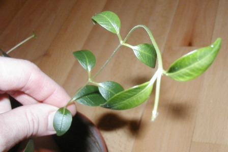 Ich habe mit einem Steckling diese Rankpflanze herangezogen. Geblüht hat sie bis jetzt noch nicht. Die Blüten sind rot und so fern ich mich richtig erinnere leicht trichterförmig. (Die Blüten duften glaub ich nicht.) Der Pflanzensaft ist weiß wie bei einem Gummibaum. Die Blätter der Originalpflanze sind etwas größer. Bei mir sind sie noch etwas mickrig.