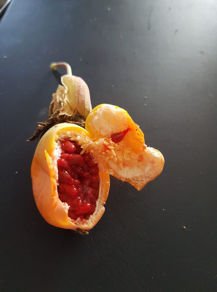 Dieses Frage wurde heute von einer Dame auf Ibiza gestellt. Es handelt sich um eine Kletterpflanze und bisher gibt es nur dieses eine Foto. Sieht aus wie eine Grenadilla (gelbe Passionsfrucht), aber die roten Kerne schliessen das aus, sie sind ausserdem geschmacksneutral. Wer kann mir sagen, was das genau ist ?