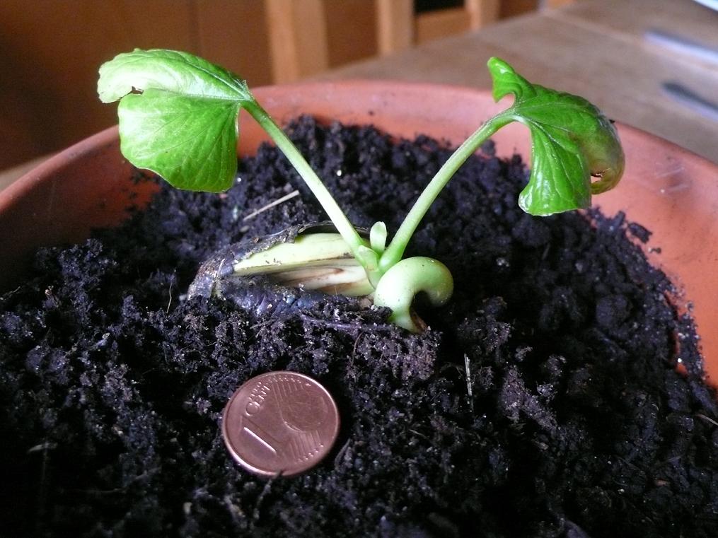 Kennt jemand diese Pflanze? Wir finden, dass die Keimblätter verhältnismäßig groß sind (der Cent zum Vergleich) und die Pflanze sehr kraftvoll aussieht. Was kann es sein?