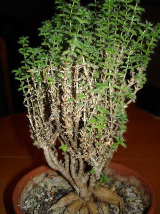 Er wächst sehr filigran und ich habe ihn schon des öfteren zurückgeschnitten. Er ist jetzt ca. 20 cm hoch und mist im Durchmesser ca. 10 cm. Seine Wurzlen bilden sich sterk aus.
