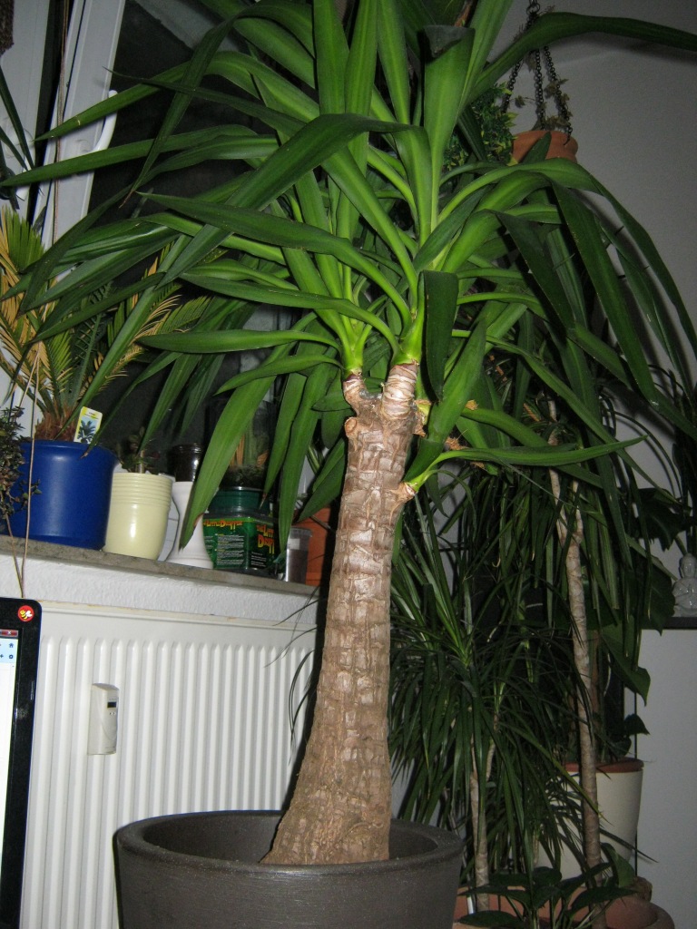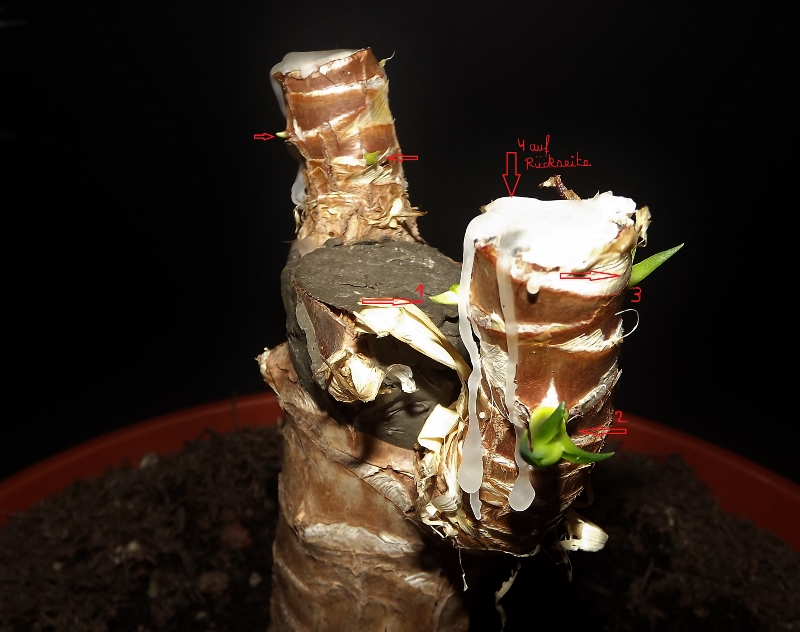 Ich hoffe, auf dem gerade gemachten Foto kann man erkennen, dass Trieb 2 und 3 ordentlich zugelegt haben. Trieb 1 ist steckengeblieben, aber noch frisch und grün. Der bekommt wohl nicht genügend Licht ab. Nr. 4 auf der Rückseite ist vertrocknet. Am anderen Stumpf die zwei Triebe sind unterschiedlich schnell gewachsen. Während der eine auf der Vorderseite inzwischen so groß ist wie Trieb Nr. 2 am anderen Stumpf, ist der zweite an der Seite noch entwicklungsfähig, aber gesund und frisch.