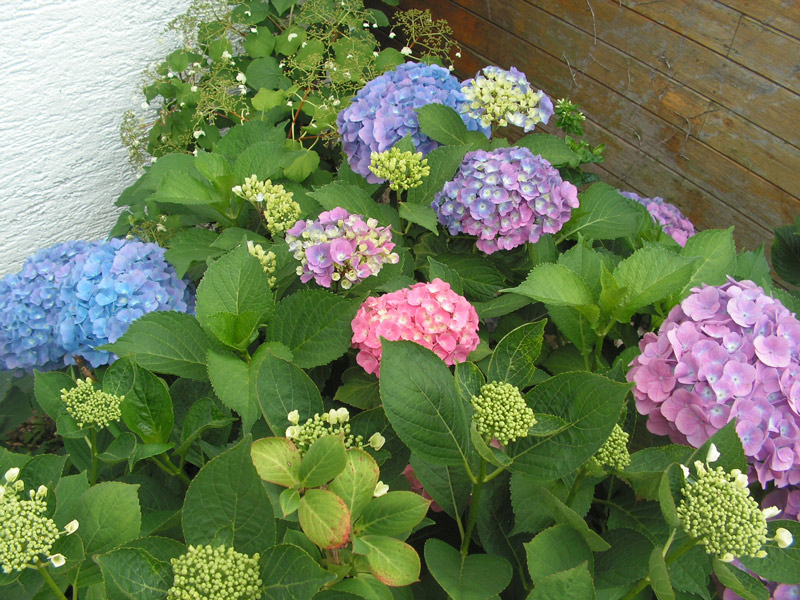 2. Klar sind rosa Hortensien auch schön, nur blau wär auch langweilig. Ich mag's am liebsten gemischt, was sie über der Ofenplatte auch jährlich wechselnd fein hinkriegen.
