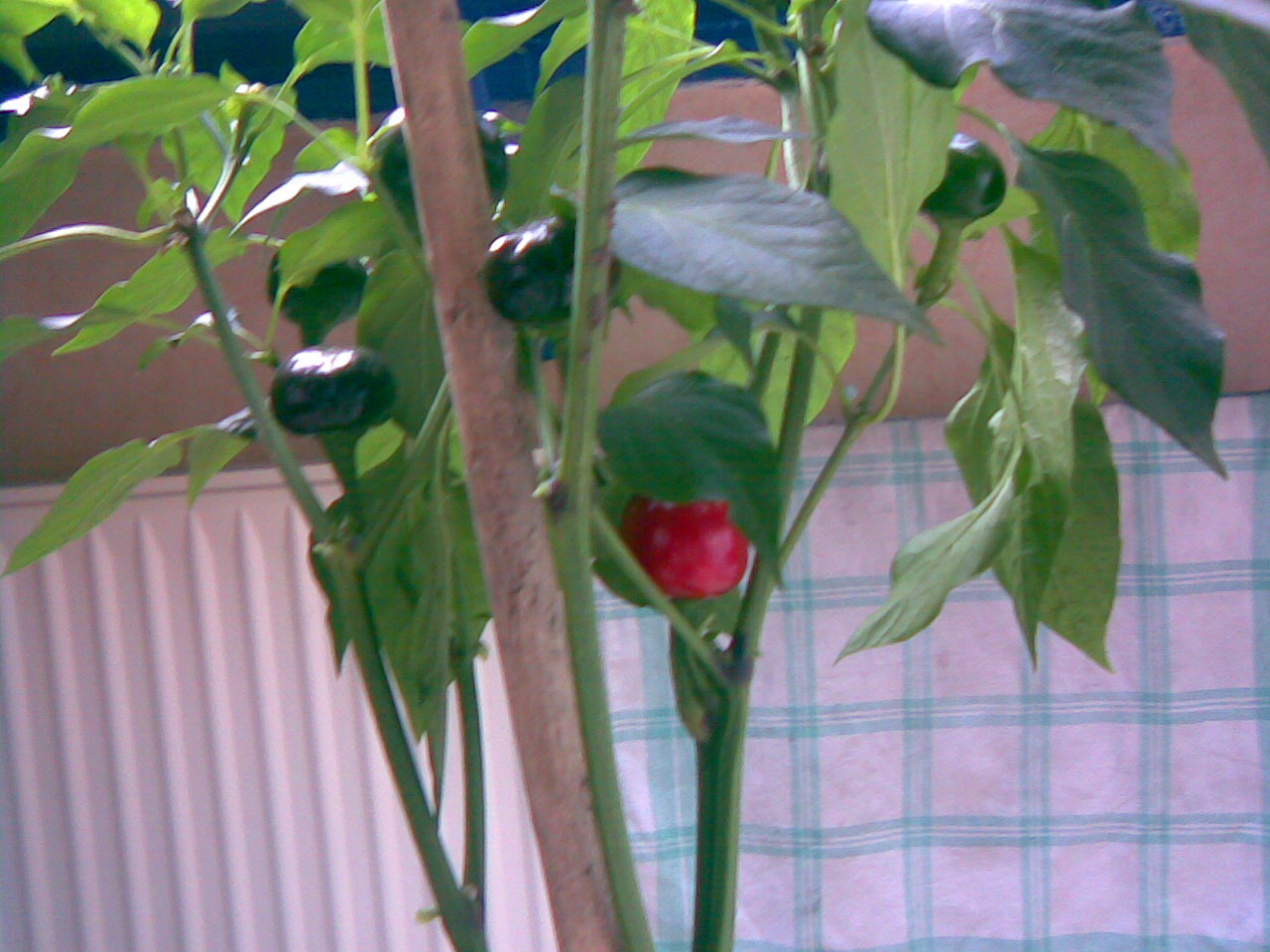 allerdings habe ich von meiner im letzten sommer gezogenen thai-chilli, die dann massiv im februar anfing zu blühen (und ich hab mit dem pinsel "bienchen" gespielt....) bis zum sommer, als ich sie auf die terrasse stellen konnte bereits eine reiche ernte bekommen, den sommer über nochmal bestimmt 100 reife schoten und jetzt - pünktlich vor dem ersten frost (der heute morgen war ) habe ich sie wieder reingeholt: sie hat knospen, blüten, fruchtansätze und sowohl grüne wie bereits rote früchte - also ganzjahresernte