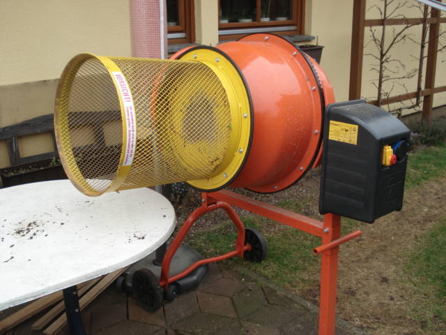 da man(n), also ich, ja nicht jünger wird, wollte ich mir die arbeit erleichtern. dafür habe ich mir im vergangenen jahr einen vorsatz für den betonmischer gekauft, einen sogenannten siebkorb. unter das ganze stelle ich ne schubkarre. beim sieben fällt das zu grosse, nicht fertig kompostierte vorn wieder heraus. die erde fällt in die schubkarre und wird von dort aus gleich dorthin geschafft, wo sie gebraucht wird.