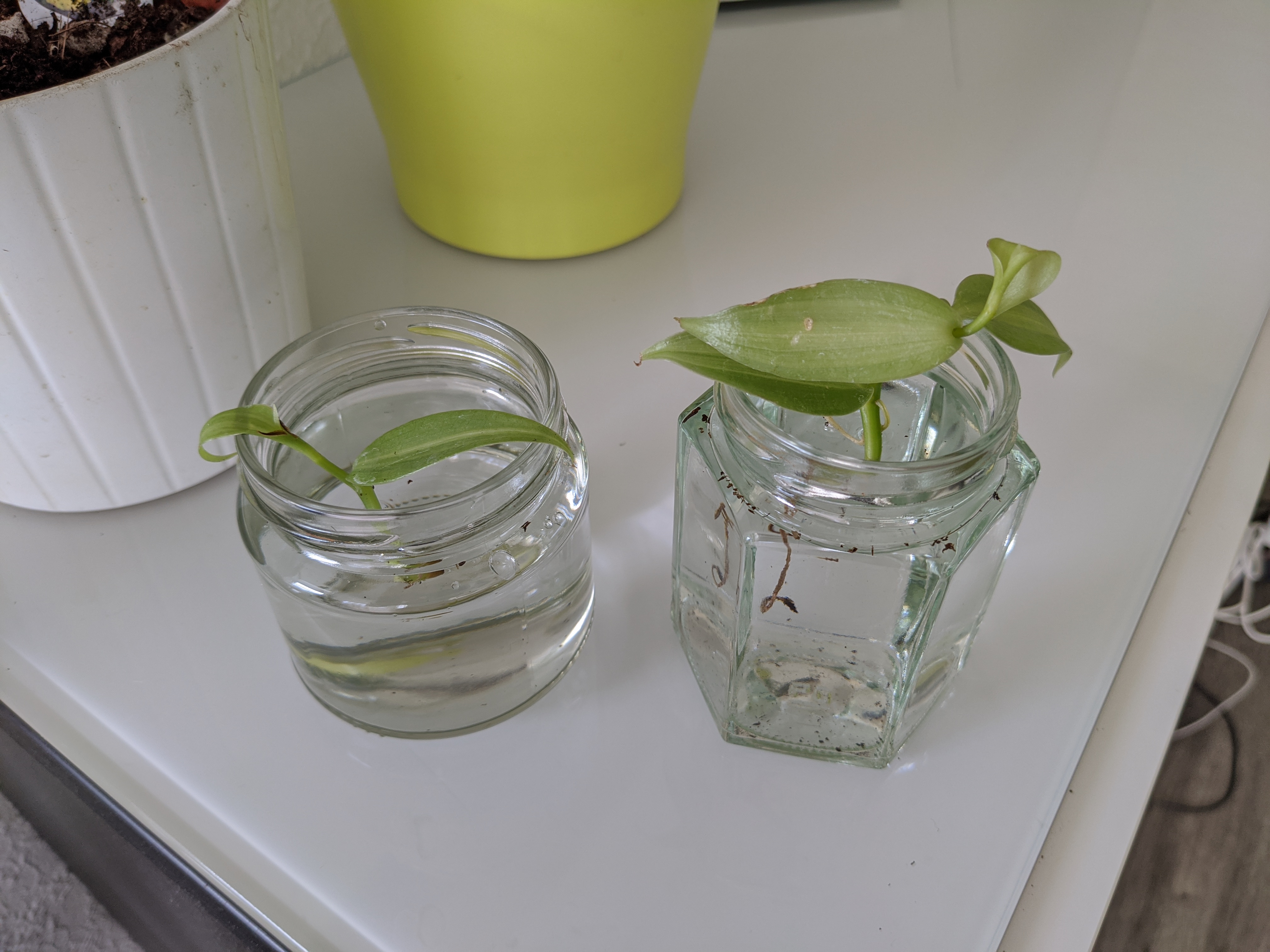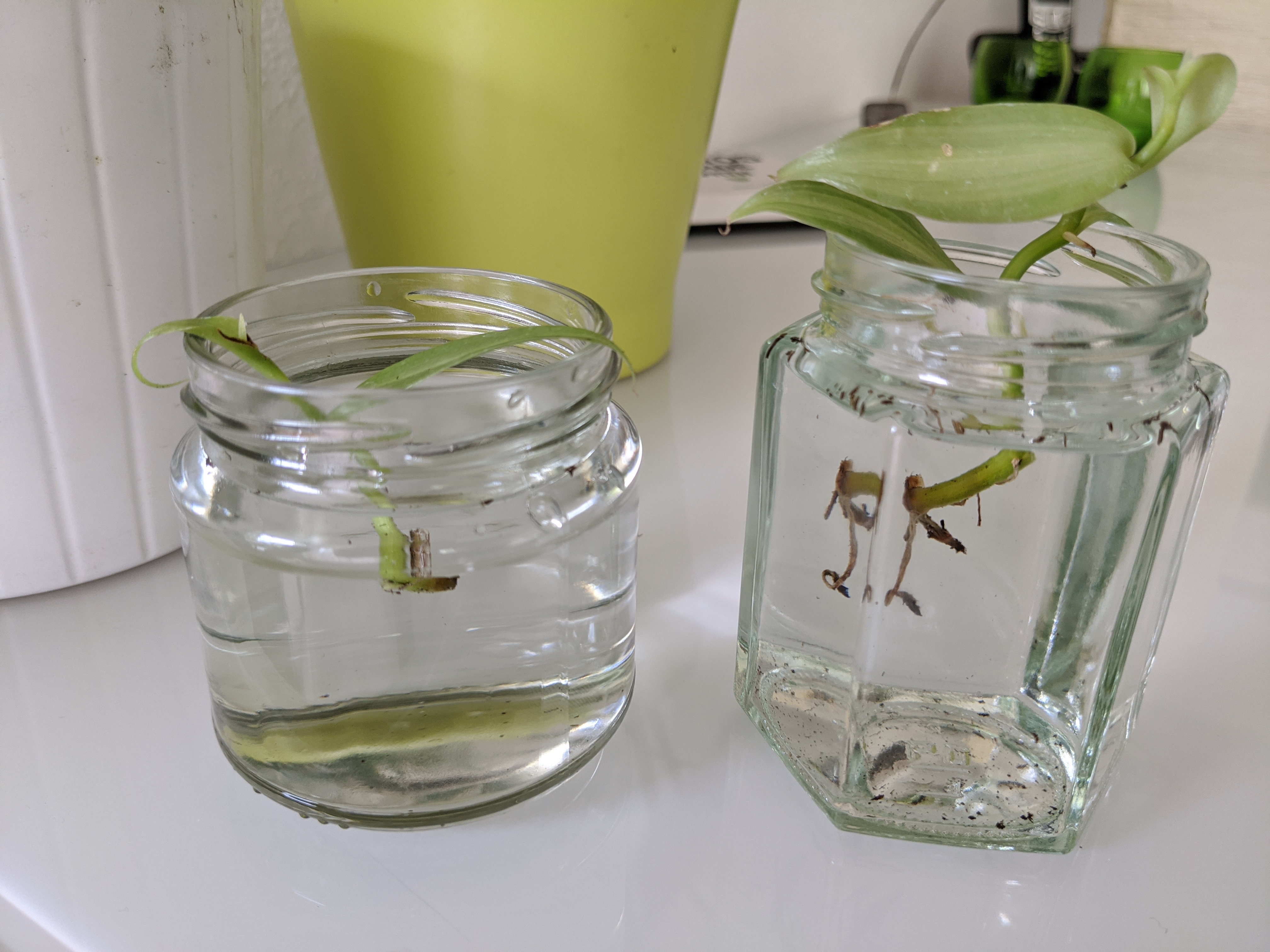 Inzwischen sind alle 3 Stecklinge von der Wurzel her verfault, vertrocknet oder beides. Ich bin mir nicht ganz sicher. Der obere Teil ist aber jeweils noch grün, und schauen eigentlich ok aus. Die Blätter sind dick und es gibt auch 1-2 Luftwurzel. Die wiederum schauen aber auch etwas trocken aus.