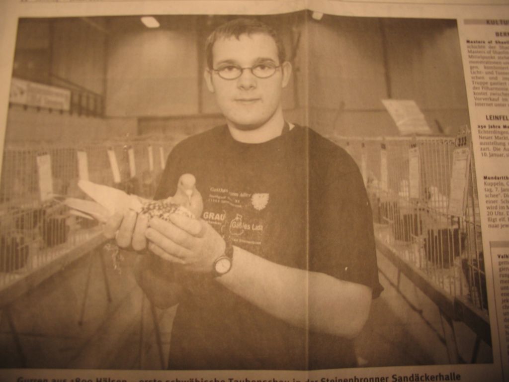 muss mir mal überlegen ob ich ein Bild von mir reinstell Muss mal den Zeitungsartikel suchen wo ich gaaaaaaaaaanz groß mit einer meiner Tauben drin bin, dann bekommt ihr auch ein Bild von mir zu gesicht