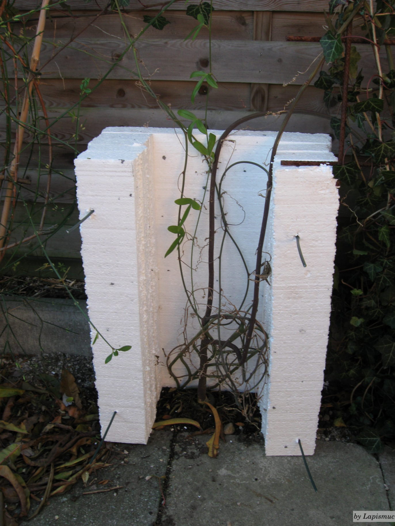 Die Leine geht mittig nach vorne über das Häuschen weg zu anderen Steinen und von da aus wieder über das Häuschen. Festgemacht ist das an der Gitterstabmatte (am Pfosten) rechts: